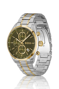 DETAILS GRAND PRIX 44 - 58244951 Combining olive, golden and silver tones, this BOSS Menswear watch takes inspiration from the sleek lines of classic cars. Dashboard-style subeyes for maximum function. Watch mechanism: Chronograph Dial color: Olive color Strap material: Stainless steel Closure: Push-button deployment Case size: 1.73 in (44 mm) (0 inches) Water Resistance (in ATM): 5 ATM QUALITY & CARE INSTRUCTIONS Quality: 100% Stainless steel
