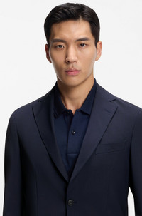 SIZE AND FIT The model wears a size 38R and is 6'1" tall with a, 36" chest, 29" waist and 36" hips. DETAILS In a super-flex wool blend with a clean slim fit, this washable BOSS Menswear blazer makes formals easy. Breathable with unconstructed shoulders for comfort. Slim fit Notched lapels Fastening top: Button closure Number of buttons: 2 Welt chest pockets Kissing buttons on the cuff Side vent Unlined P-Hanry-WG-253 - 50556757 QUALITY & CARE INSTRUCTIONS Iron Low Heat Do Not Bleach Material: 55% Virgin wool, 41% Polyester, 4% Elastane, Lining: 58% Polyamid, 42% Polyester, Sleeve lining: 95% Polyester, 5% Elastane Cold, gentle machine wash; reduced spin speed. Do Not Tumble Dry Reduced Dry Clean
