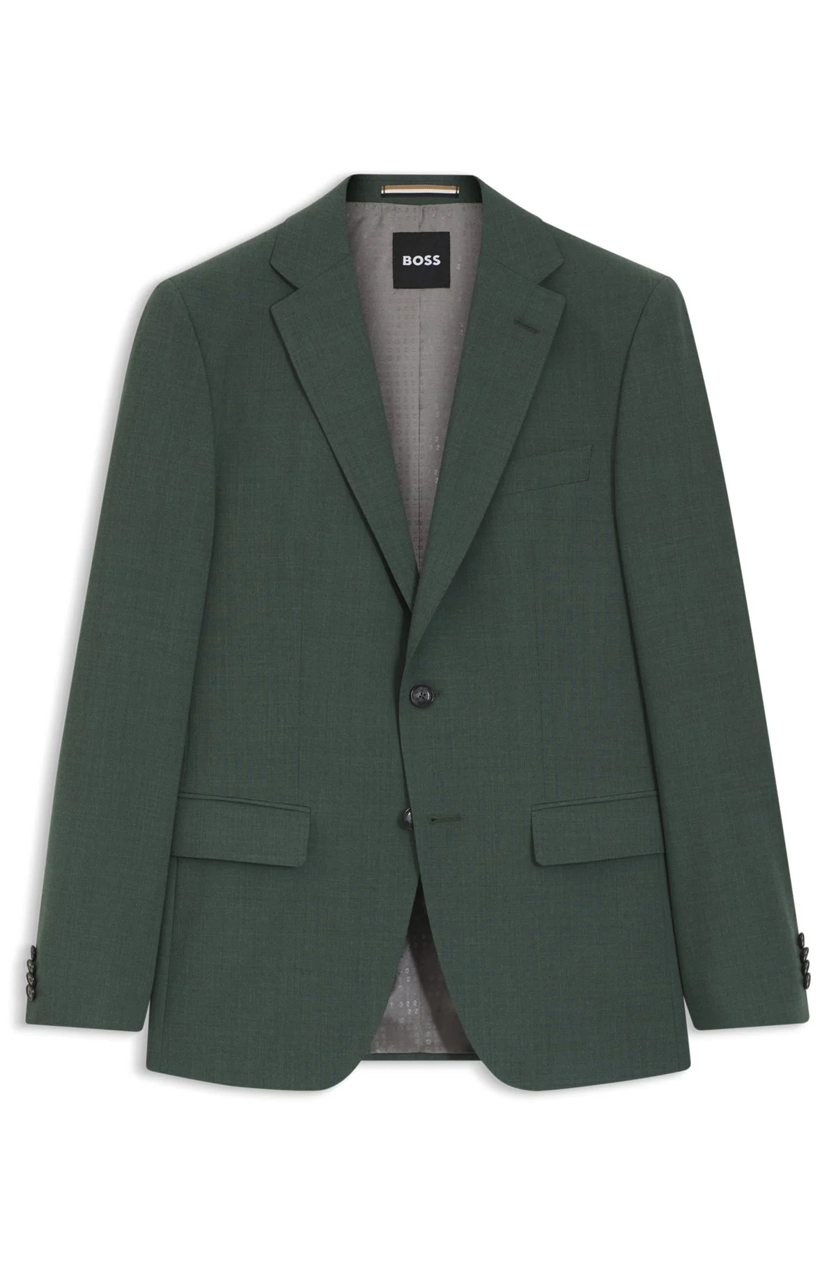DETAILS Refresh your business collection with the slim cut and easy care of this timeless BOSS Menswear blazer. Washable stretch fabric blended with virgin wool. Slim fit Notched lapels Fastening top: Button closure Number of buttons: 2 Welt chest pockets Pockets top: Jetted pockets Button cuffs Fully lined H-Hutson-251 - 50557328 QUALITY & CARE INSTRUCTIONS Do Not Bleach Do Not Wash Iron Low Heat Material: 52% Polyester, 43% Virgin wool, 5% Elastane, Lining: 100% Viscose, Sleeve lining: 100% Viscose Reduced Dry Clean Do Not Tumble Dry