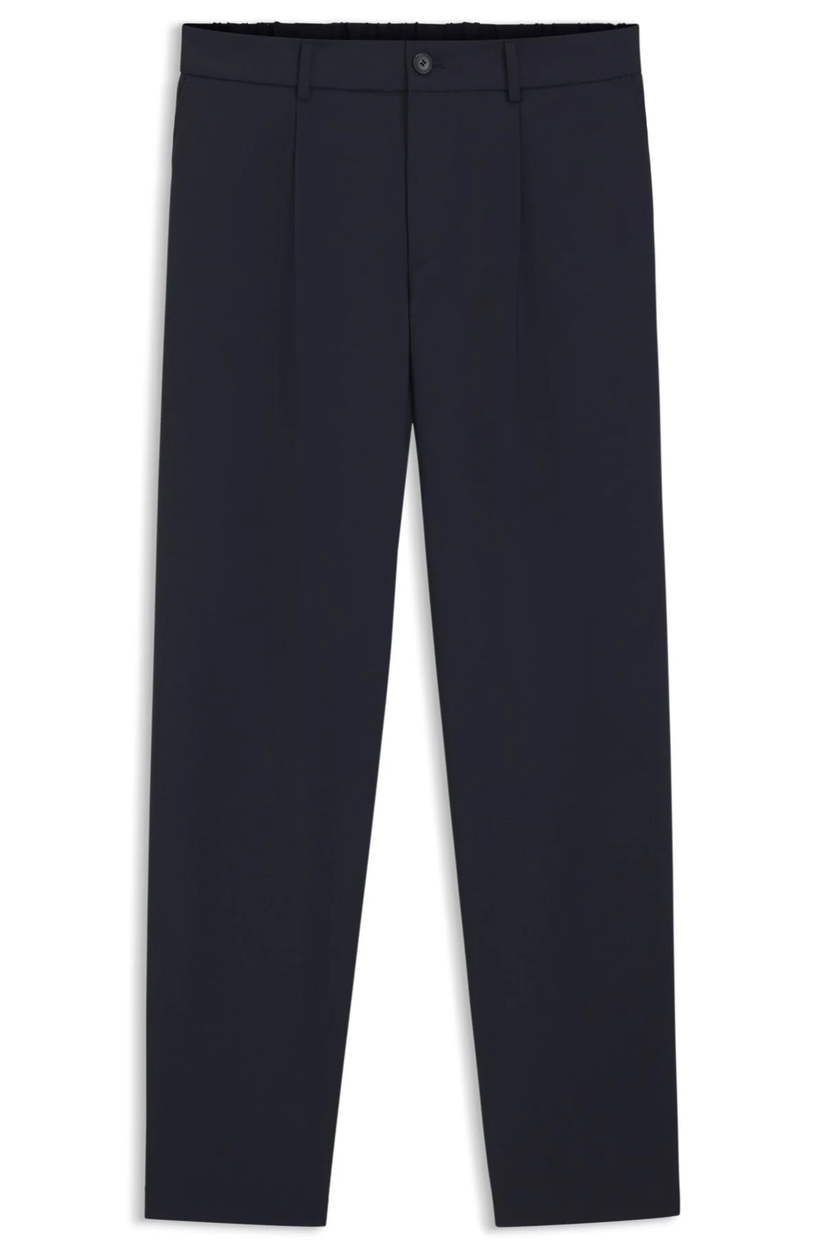 SIZE AND FIT The model wears a size 32R and is 6'1" tall with a, 36" chest, 29" waist and 36" hips. DETAILS With added stretch for comfort, these high-performance BOSS Menswear trousers are cut in a breathable, washable wool blend. Contemporary tapered fit with front pleats. Tapered fit Button and zip closure Elastic Waistband Pockets bottom front: French pocket Pockets bottom back: Jetted pockets Partially lined P-Phil-PL-CW-WG-261 - 50556759 QUALITY & CARE INSTRUCTIONS Do Not Bleach Do Not Tumble Dry Reduced Dry Clean Cold, gentle machine wash; reduced spin speed. Material: 55% Virgin wool, 41% Polyester, 4% Elastane, pocketing: 58% Polyamid, 42% Polyester Iron Low Heat