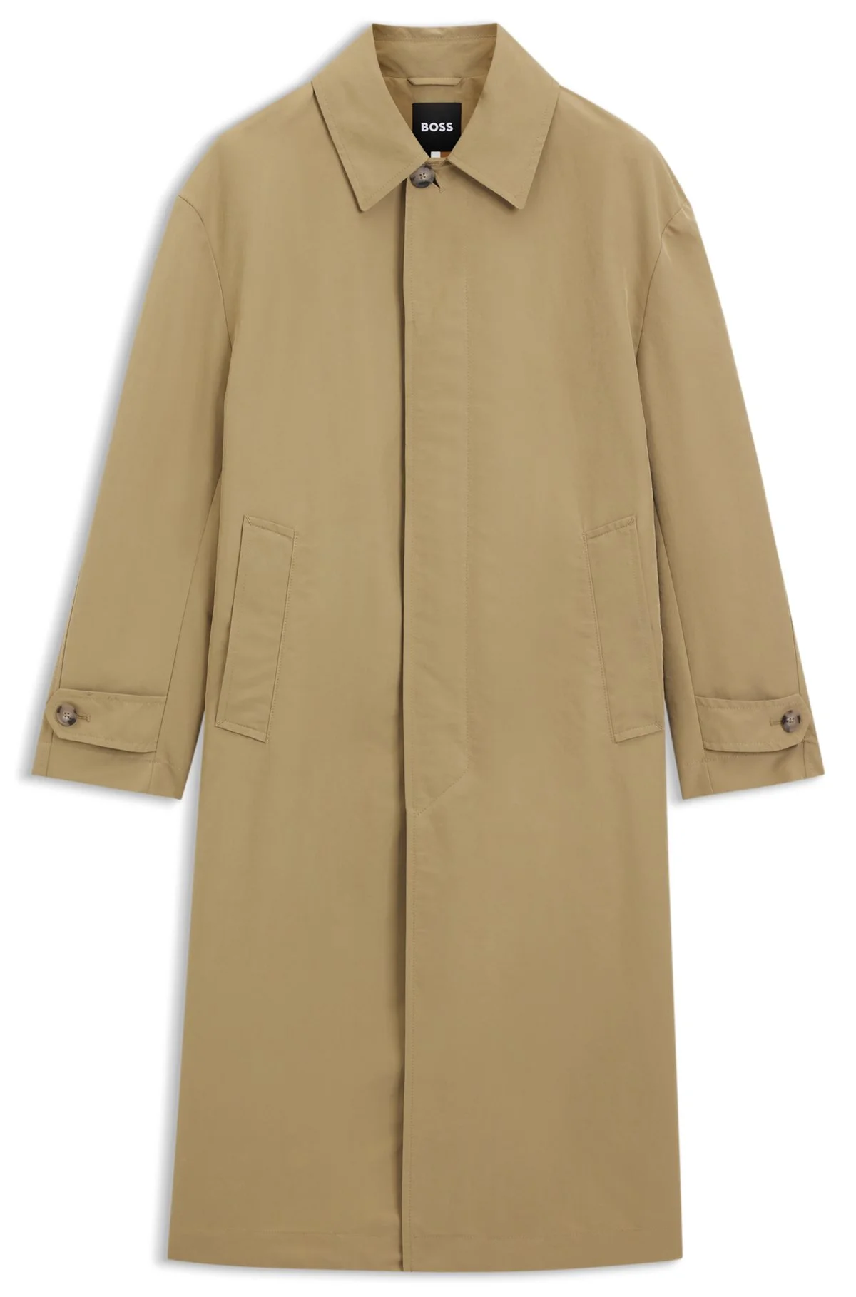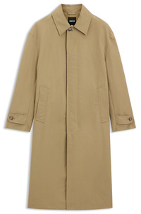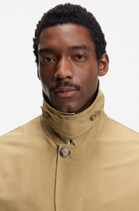 SIZE AND FIT The model wears a size 38R and is 6'1" tall with a, 36" chest, 29" waist and 37" hips. DETAILS With its wind-trap collar and water-repellent finish, this BOSS Menswear coat is a must on unpredictable days. Laid-back fit, weighty peached fabric. Relaxed fit Point collar Fastening top: Zip closure Pockets top: Side-entry pockets Button cuffs Back vent Unlined C-Colin-261F - 50554158 QUALITY & CARE INSTRUCTIONS Do Not Tumble Dry very mild professional wet clean Do Not Bleach Do Not Dry Clean Do Not Wash Iron Low Heat Material: 70% Polyester, 30% Polyamid, Lining: 100% Viscose
