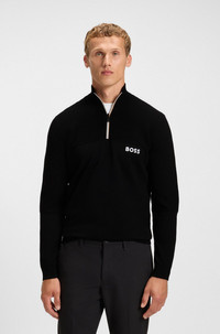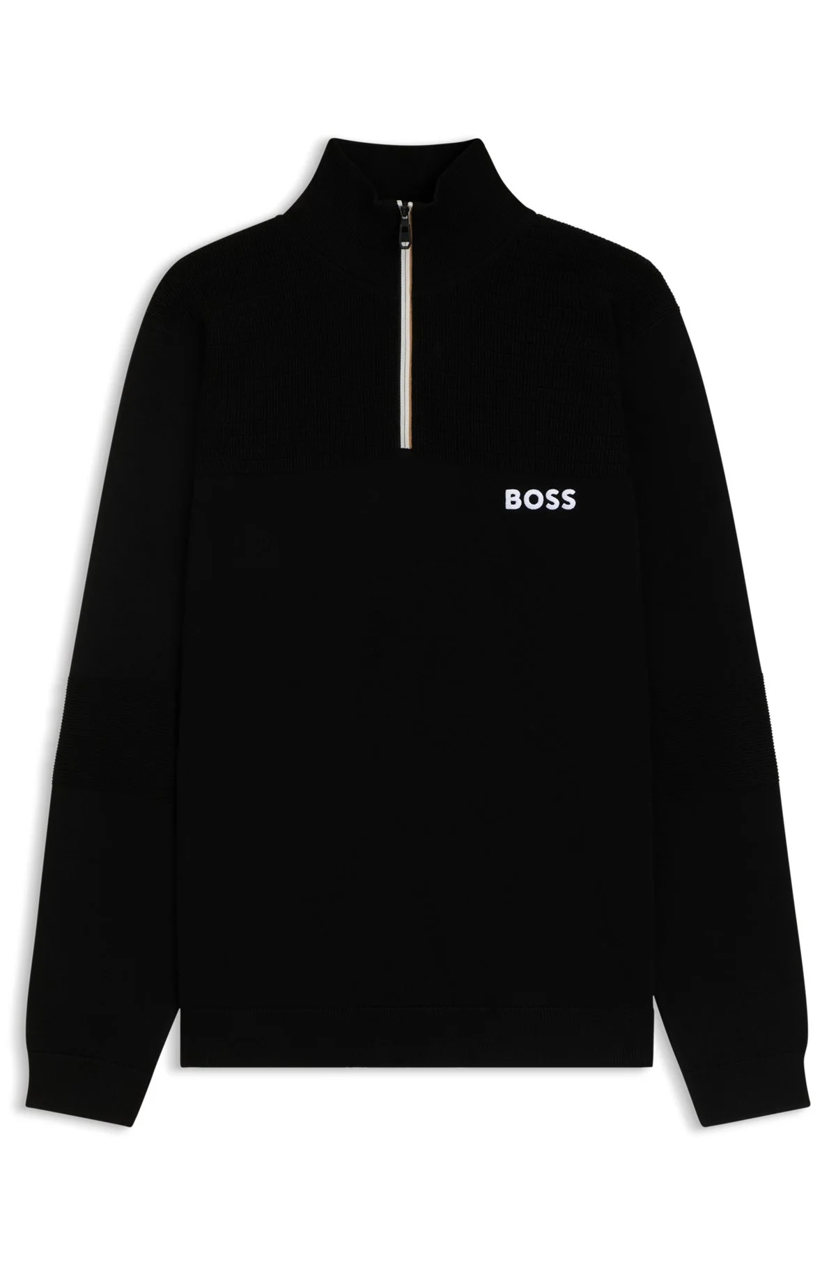 DETAILS K_Hydro QZ-1 - 50541953 In a straight fit, this water-repellent BOSS Menswear sweater is inspired by golfing styles. Cotton with structure blocking and embroidered branding. Regular fit Neckline: Zip neck Long sleeves Standard length QUALITY & CARE INSTRUCTIONS Do Not Tumble Dry Machine Wash Cold Gentle Iron Medium Heat Quality: 82% Cotton, 17% Polyester, 1% Elastane Do Not Bleach Do Not Dry Clean