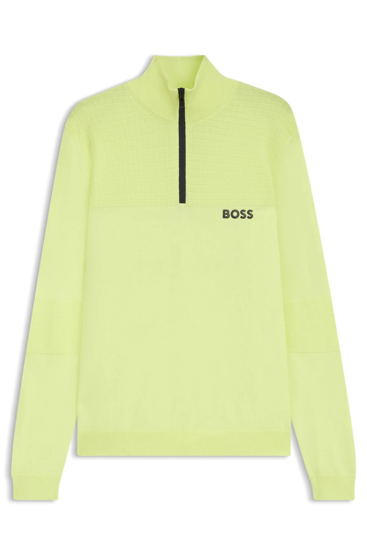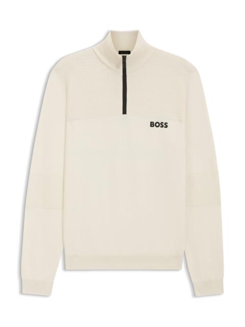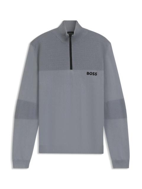 DETAILS K_Hydro QZ-1 - 50541953 In a straight fit, this water-repellent BOSS Menswear sweater is inspired by golfing styles. Cotton with structure blocking and embroidered branding. Regular fit Neckline: Zip neck Long sleeves Standard length QUALITY & CARE INSTRUCTIONS Iron Medium Heat Do Not Bleach Do Not Tumble Dry Quality: 82% Cotton, 17% Polyester, 1% Elastane Do Not Dry Clean Machine Wash Cold Gentle