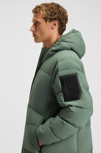SIZE AND FIT The model wears a size L and is 6'2" tall with a, 36" chest, 31" waist and 38" hips. DETAILS Cut in lightweight fabric with four-way stretch, this BOSS Menswear jacket features multiple pockets and an adjustable waist. Certified duck down and feather filling. Regular fit Hooded collar Fastening top: Zip closure Zip chest pockets Pockets top: Zip pockets Fully lined Long length Fit back length: 120 cm (47 inches) OW_Riplite Coat HD - 50543972 QUALITY & CARE INSTRUCTIONS Quality: 100% Polyamid, Lining: 100% Polyamid, Filling: 80% Duck down, 20% Duck Feather, lining yoke: 100% Polyamid Iron Low Heat Do Not Dry Clean very mild professional wet clean Do Not Wash Do Not Bleach Tumble Dry Low Heat