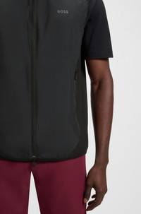 SIZE AND FIT The model wears a size M and is 6'2" tall with a, 38" chest, 31" waist and 38" hips. DETAILS V_Putt - 50533761 This BOSS Menswear golf vest offers protection when it rains and secure storage for valuables. Versatile two-way zip. Elasticated hem. Decorative reflective details. Regular fit Stand collar Fastening top: Zip closure Unlined Fit back length: 73 cm (29 inches) QUALITY & CARE INSTRUCTIONS Do Not Dry Clean Machine Wash Cold Gentle Iron Low Heat Do Not Tumble Dry Quality: 100% Elastomultiester, Front panel: 100% Polyester Do Not Bleach