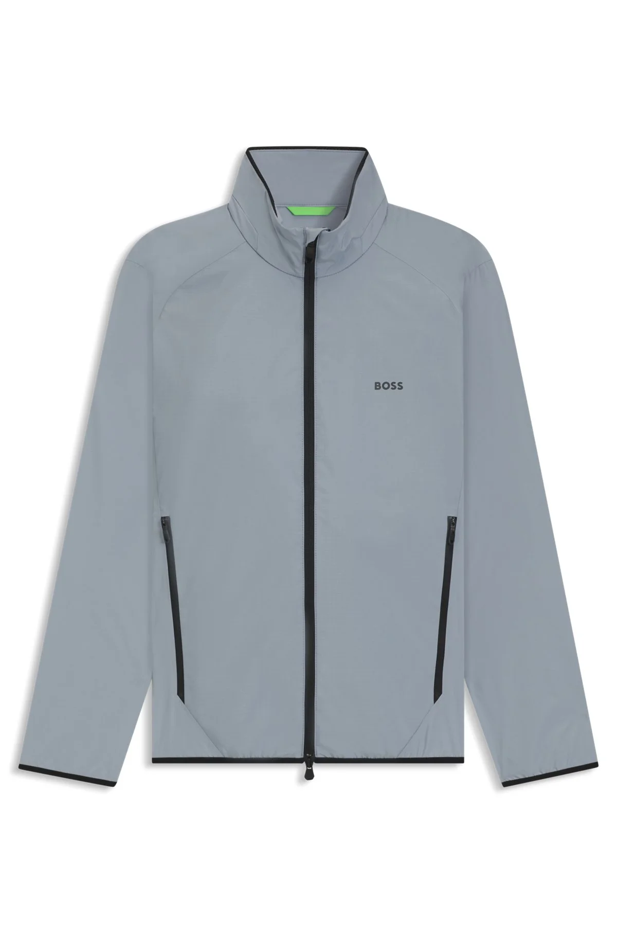 DETAILS J_Putt - 50533773 Crafted in super-stretch protective poplin, this hooded BOSS Menswear jacket is ideal for unpredictable days on the course. Secure zipped pockets. Decorative reflective accents. Fit back length: 73 cm (29 inches) QUALITY & CARE INSTRUCTIONS Do Not Bleach Do Not Dry Clean Machine Wash Cold Gentle very mild professional wet clean Iron Low Heat Do Not Tumble Dry Quality: 100% Elastomultiester, Front panel: 100% Polyester