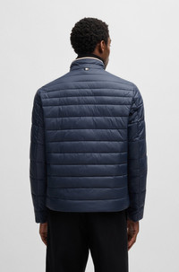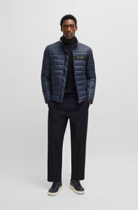 SIZE AND FIT The model wears a size 40R and is 6'1" tall with a, 36" chest, 29" waist and 37" hips. DETAILS Darolus - 50464308 A water-repellent jacket in a straight fit by BOSS. With 3D logo tape, this piece features lightweight wadding and contrast lining. Regular fit Stand collar Fastening top: Zip closure Number of buttons: 2 Pockets top: Welt pockets No cuffs Fully lined Standard length Fit back length: 67 cm (26 inches) QUALITY & CARE INSTRUCTIONS very mild professional wet clean Quality: 100% Polyamide, Lining: 100% Polyamid, Filling: 100% Polyester Do Not Tumble Dry Do Not Bleach Do Not Wash Iron Low Heat Do Not Dry Clean