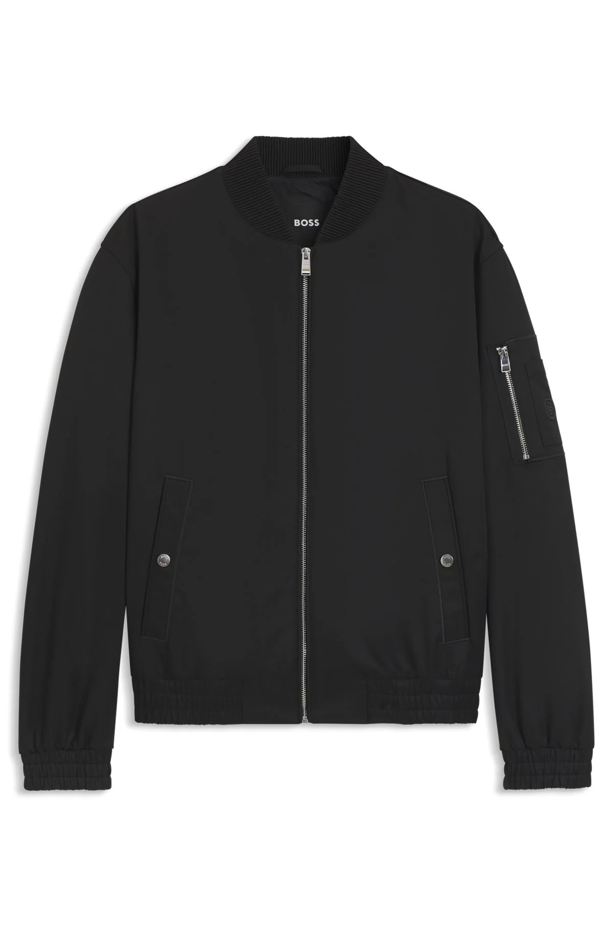 SIZE AND FIT The model wears a size 38R and is 6'1" tall with a, 36" chest, 29" waist and 37" hips. DETAILS H-Comber-253 - 50544097 With a water-repellent finish for everyday protection, this BOSS Menswear jacket is cut in stretch twill. Double B monogram on the zipped sleeve pocket. Regular fit Fastening top: Zip closure Pockets top: Welt pockets Inside zip pockets Elasticized cuffs Fully lined Fit back length: 66 cm (26 inches) QUALITY & CARE INSTRUCTIONS Do Not Bleach Quality: 100% Polyester (48% recycled), Lining: 100% Polyamide Do Not Dry Clean Iron Low Heat Tumble Dry Low Heat Machine Wash Cold Gentle