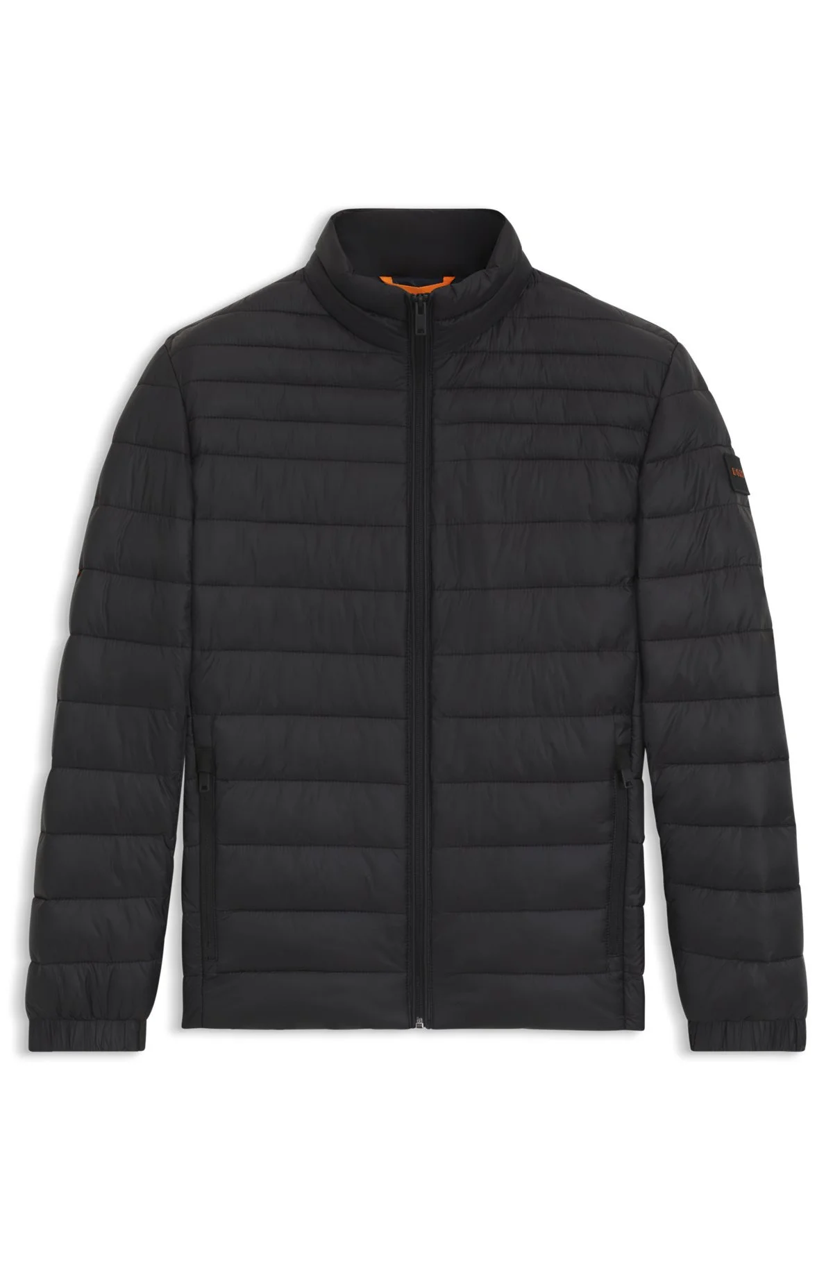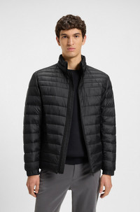 SIZE AND FIT The model wears a size 38R and is 6'2" tall with a, 37" chest, 30" waist and 37" hips. DETAILS Oden2 - 50530822 Packable for protection on the go, this slim-fit BOSS Menswear jacket has a water-repellent finish. Mix of straight and slanted quilting. Slim fit Standard length Fit back length: 70 cm (28 inches) QUALITY & CARE INSTRUCTIONS Quality: 100% Polyamide, Filling: 100% Polyester, lining yoke: 100% Polyester, Body Lining: 100% Polyamid Tumble Dry Low Heat Do Not Dry Clean Machine Wash Cold Gentle Iron Low Heat Do Not Bleach