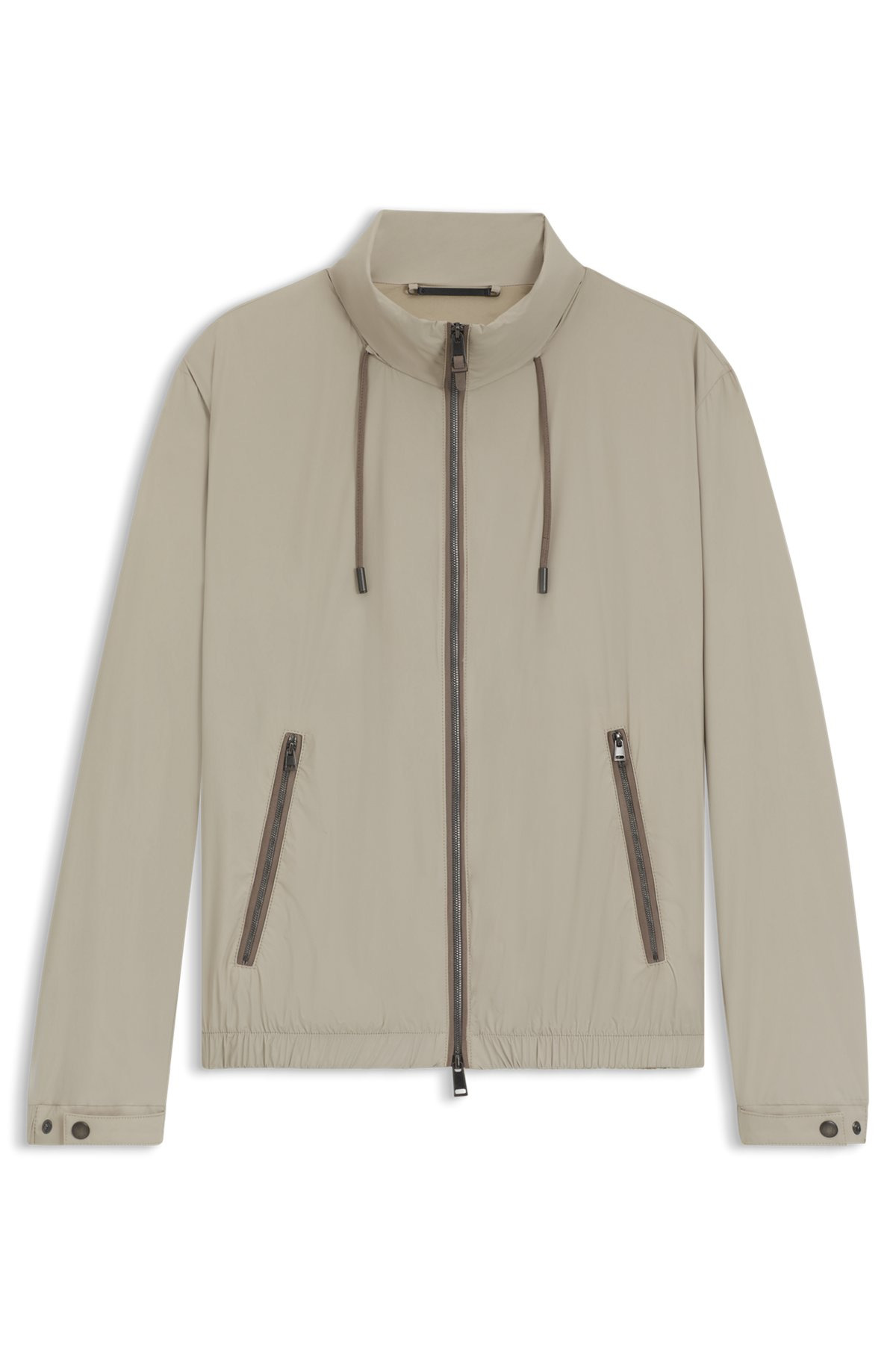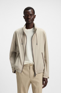 SIZE AND FIT The model wears a size 38R and is 6'1" tall with a, 33" chest, 31" waist and 33" hips. DETAILS L-Calmo - 50543510 With stretch lining and a water-repellent finish, this BOSS Menswear windbreaker is great for staying protected on the go. Packable hood. Regular fit. Regular fit Hooded collar Fastening top: Zip closure Pockets top: Slant pockets Inside zip pockets Adjustable cuffs Fully lined Standard length Fit back length: 66 cm (26 inches) QUALITY & CARE INSTRUCTIONS Machine Wash Cold Gentle Reduced Dry Clean Do Not Bleach Do Not Tumble Dry Quality: 86% Polyamid, 14% Elastane, Lining: 96% Cupro, 4% Elastane Iron Low Heat