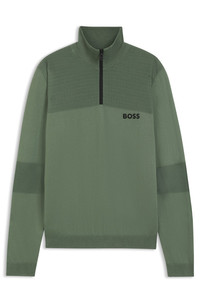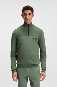 SIZE AND FIT The model wears a size M and is 6'2" tall with a, 37" chest, 29" waist and 37" hips. DETAILS In a straight fit, this water-repellent BOSS Menswear sweater is inspired by golfing styles. Cotton with structure blocking and embroidered branding. Regular fit Neckline: Zip neck Long sleeves Standard length K_Hydro QZ-1 - 50541953 QUALITY & CARE INSTRUCTIONS Material: 82% Cotton, 17% Polyester, 1% Elastane Do Not Bleach Do Not Dry Clean Machine Wash Cold Gentle Do Not Tumble Dry Iron Medium Heat