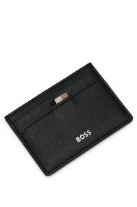 DETAILS Zair_Card holder - 50498629 A refined card holder in structured, high-shine material by BOSS. This accessory features a signature-stripe trim and a logo detail. Measurements: 10 x 7cm Length: 10,0 cm (3.9 inches) Height: 7,0 cm (2.8 inches) 1 inside open pocket 4 credit card slots Hardware finishing: Polished silver hardware Fully lined Exterior embossed logo Packaging: Box QUALITY & CARE INSTRUCTIONS Quality: 100% Regenerated leather, Lining: 100% Polyester, Facing: 100% Polyamide