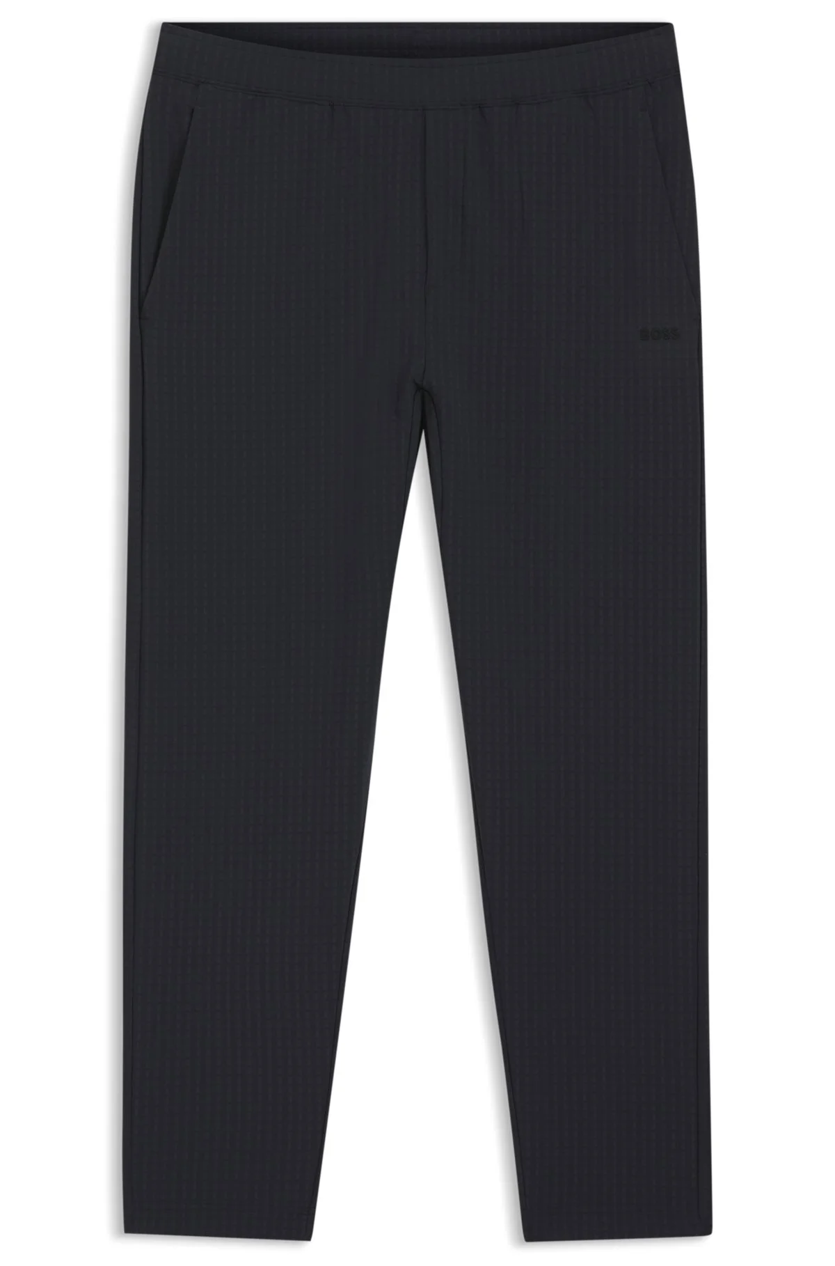 DETAILS With a distinctive framed zip at the back pocket, these BOSS Menswear drawstring trousers are a sporty foundation. Stretchy, lightweight waffle fabric. Soft-touch branding. Drawstring Pockets bottom front: Side pockets Pockets bottom back: Back zip pocket JT_Terrace Tapered - 50558503 QUALITY & CARE INSTRUCTIONS Material: 92% Polyester, 8% Elastane Iron Low Heat Do Not Bleach Do Not Tumble Dry Do Not Dry Clean Machine Wash Cold Gentle