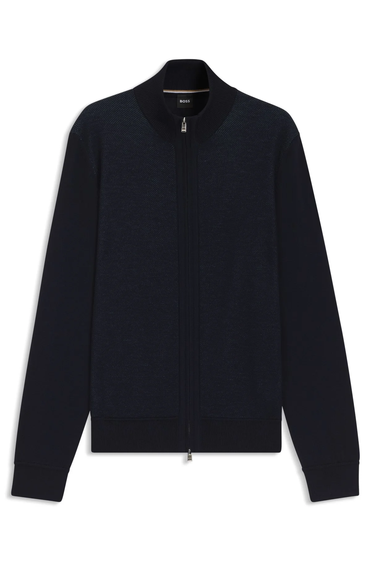 SIZE AND FIT The model wears a size M and is 6'2" tall with a, 37" chest, 29" waist and 37" hips. DETAILS H-Illarione - 50543153 With a structured front panel blended with cotton, this regular-fit BOSS Menswear cardigan is a fresh layer. Crafted in soft wool. Regular fit Neckline: Zip neck Long sleeves Standard length QUALITY & CARE INSTRUCTIONS Quality: 100% Virgin wool, Front panel: 76% Virgin wool, 24% Cotton Cold, gentle machine wash; reduced spin speed. Dry Clean Only Do Not Tumble Dry Do Not Bleach Iron Medium Heat