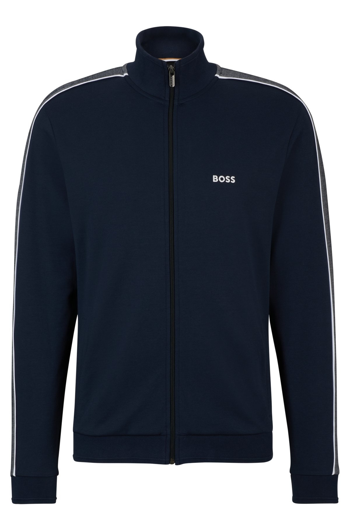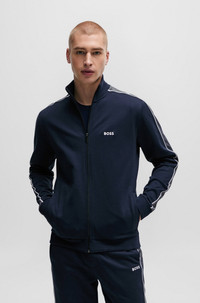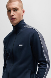 SIZE AND FIT The model wears a size M and is 6'2" tall with a, 38" chest, 31" waist and 37" hips. DETAILS Tracksuit Jacket - 50511041 A zip-up jacket by BOSS Menswear, cut to a straight fit in pique with contrast trims and an embroidered logo. Regular fit Neckline: Zip neck Pockets top: Seam pocket QUALITY & CARE INSTRUCTIONS Do Not Dry Clean Do Not Tumble Dry Quality: 70% Cotton, 30% Polyester Machine Wash Warm Iron Low Heat Do Not Bleach