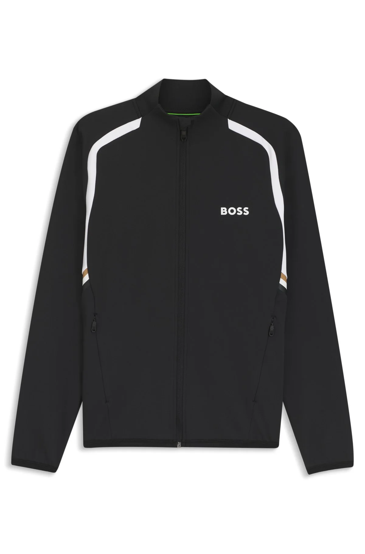 SIZE AND FIT The model wears a size L and is 6'2" tall with a, 37" chest, 29" waist and 37" hips. DETAILS Cut in luxuriously soft stretch gabardine with temperature-regulating and quick-dry performance, this sporty BOSS Menswear sweatshirt features striped trims. Regular fit. Zipped pockets. Regular fit Neckline: Stand collar Fastening top: Zip closure Pockets top: Zip pockets Long sleeves Elasticized cuffs Standard length SW_TOC Spin FZ - 50554402 QUALITY & CARE INSTRUCTIONS Do Not Iron Material: 91% Polyester, 9% Elastane Do Not Tumble Dry Do Not Bleach Cold, gentle machine wash; reduced spin speed. Do Not Dry Clean