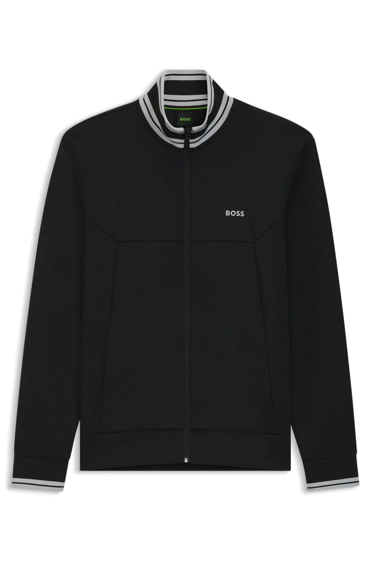 DETAILS FZ Zone - 50543081 In a straight fit, this BOSS Menswear zipped sweatshirt offers an easy-wear layer. Cotton with stretch. Punctuated by stripes and a molded logo. Regular fit Neckline: Ribbed collar Fastening top: Zip closure Pockets top: Side-entry pockets Long sleeves Ribbed cuffs Standard length QUALITY & CARE INSTRUCTIONS Quality: 62% Cotton, 33% Polyester, 5% Elastane, pocketing: 100% Polyester Do Not Tumble Dry Iron Low Heat Do Not Bleach Machine Wash Cold Gentle Do Not Dry Clean