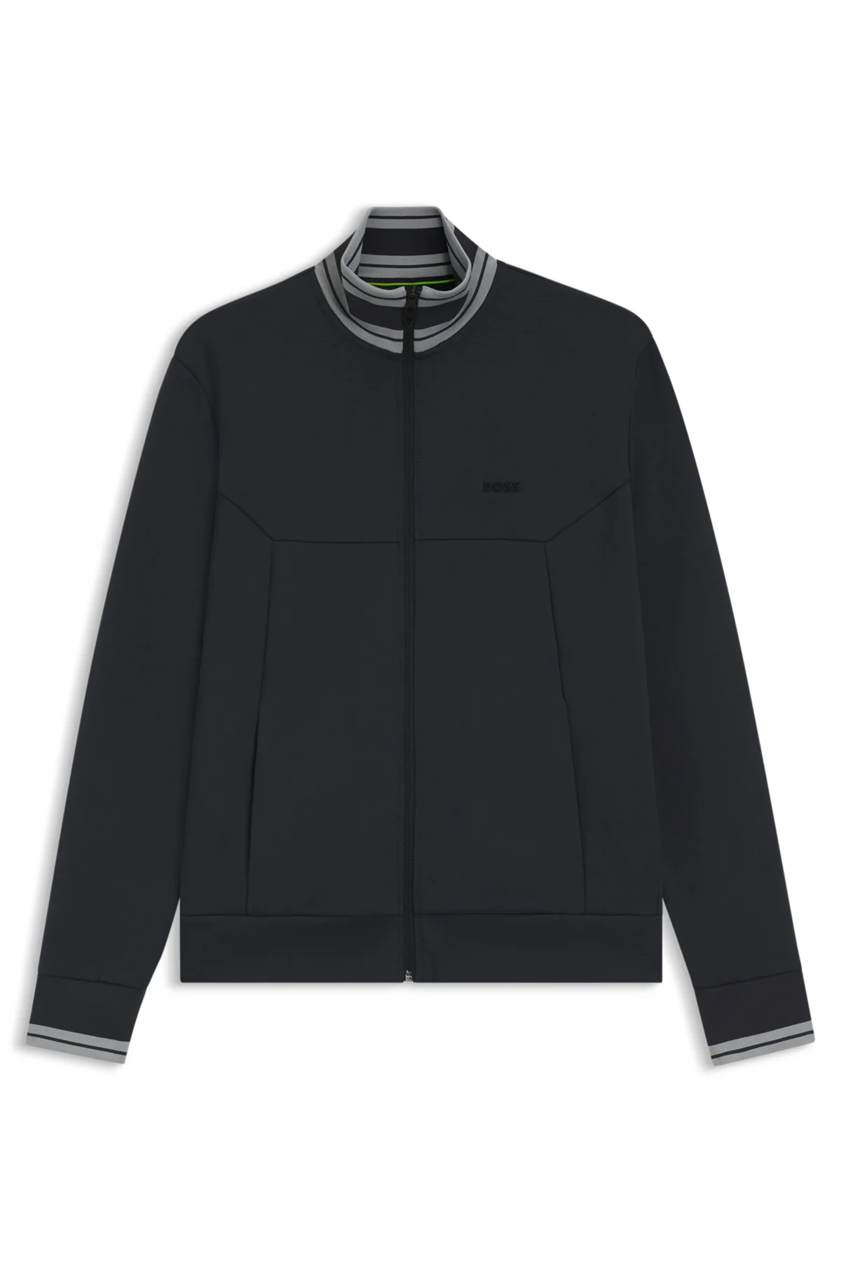 SIZE AND FIT The model wears a size M and is 6'0" tall with a, 38" chest, 29" waist and 38" hips. DETAILS FZ Zone - 50543081 In a straight fit, this BOSS Menswear zipped sweatshirt offers an easy-wear layer. Cotton with stretch. Punctuated by stripes and a molded logo. Regular fit Neckline: Ribbed collar Fastening top: Zip closure Pockets top: Side-entry pockets Long sleeves Ribbed cuffs Standard length QUALITY & CARE INSTRUCTIONS Do Not Tumble Dry Machine Wash Cold Gentle Iron Low Heat Quality: 62% Cotton, 33% Polyester, 5% Elastane, pocketing: 100% Polyester Do Not Bleach Do Not Dry Clean
