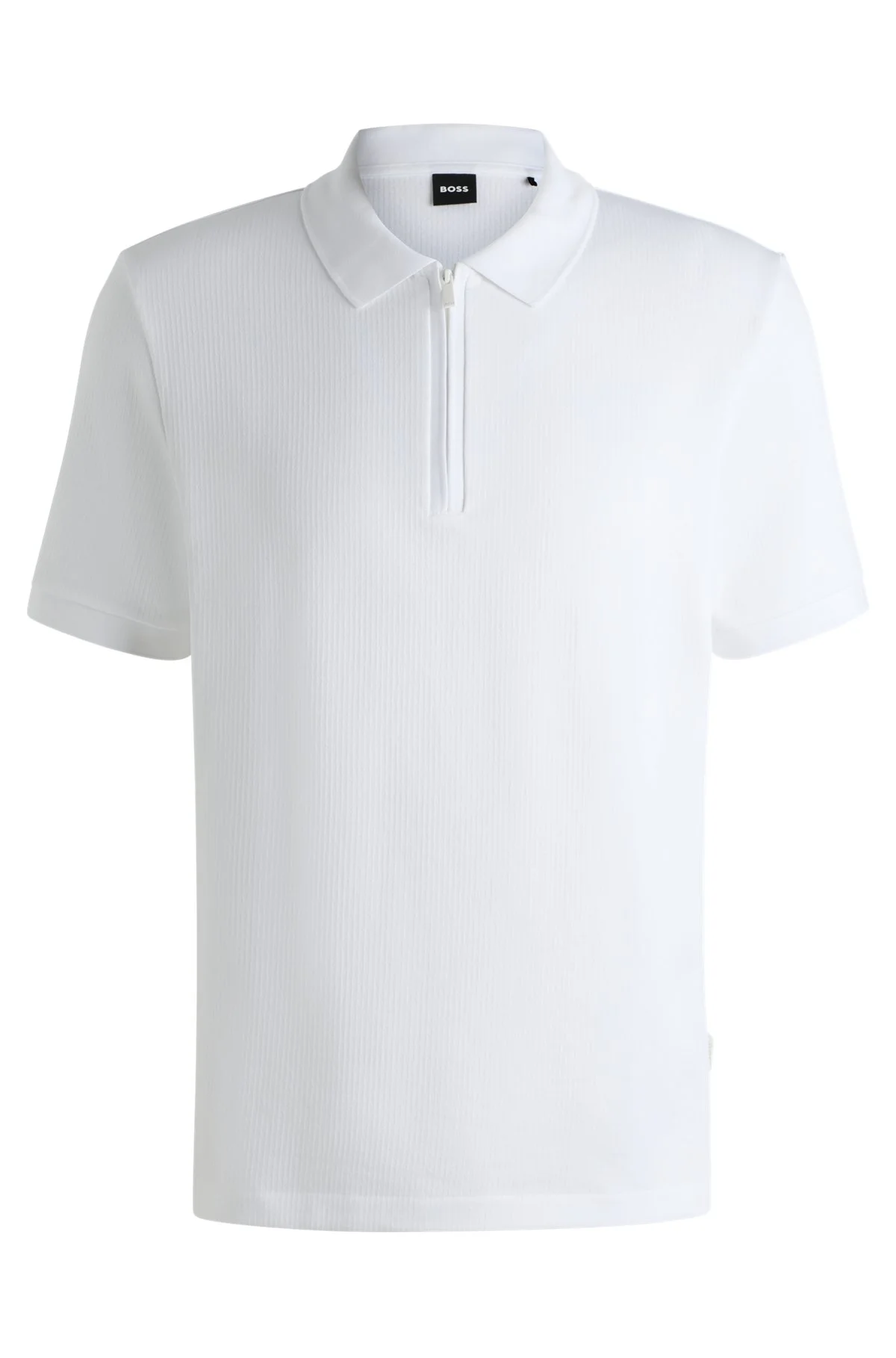 SIZE AND FIT The model wears a size M and is 6'2" tall with a, 37" chest, 33" waist and 35" hips. DETAILS P-Paras 25 - 50537494 Cut to a straight fit, this BOSS Menswear polo shirt is a new-season must. Topped with a zipped placket for a clean look, this polo shirt is engineered in seersucker to create comfortable airflow in warmer temperatures. Stretch in the fabric allows for easy movement. Regular fit Neckline: Flat-knit collar Fastening top: Zip closure Flat-knit cuffs Side slit QUALITY & CARE INSTRUCTIONS Cold, gentle machine wash; reduced spin speed. Do Not Tumble Dry Iron Low Heat Quality: 54% Cotton, 42% Polyester, 4% Elastane Do Not Bleach Do Not Dry Clean