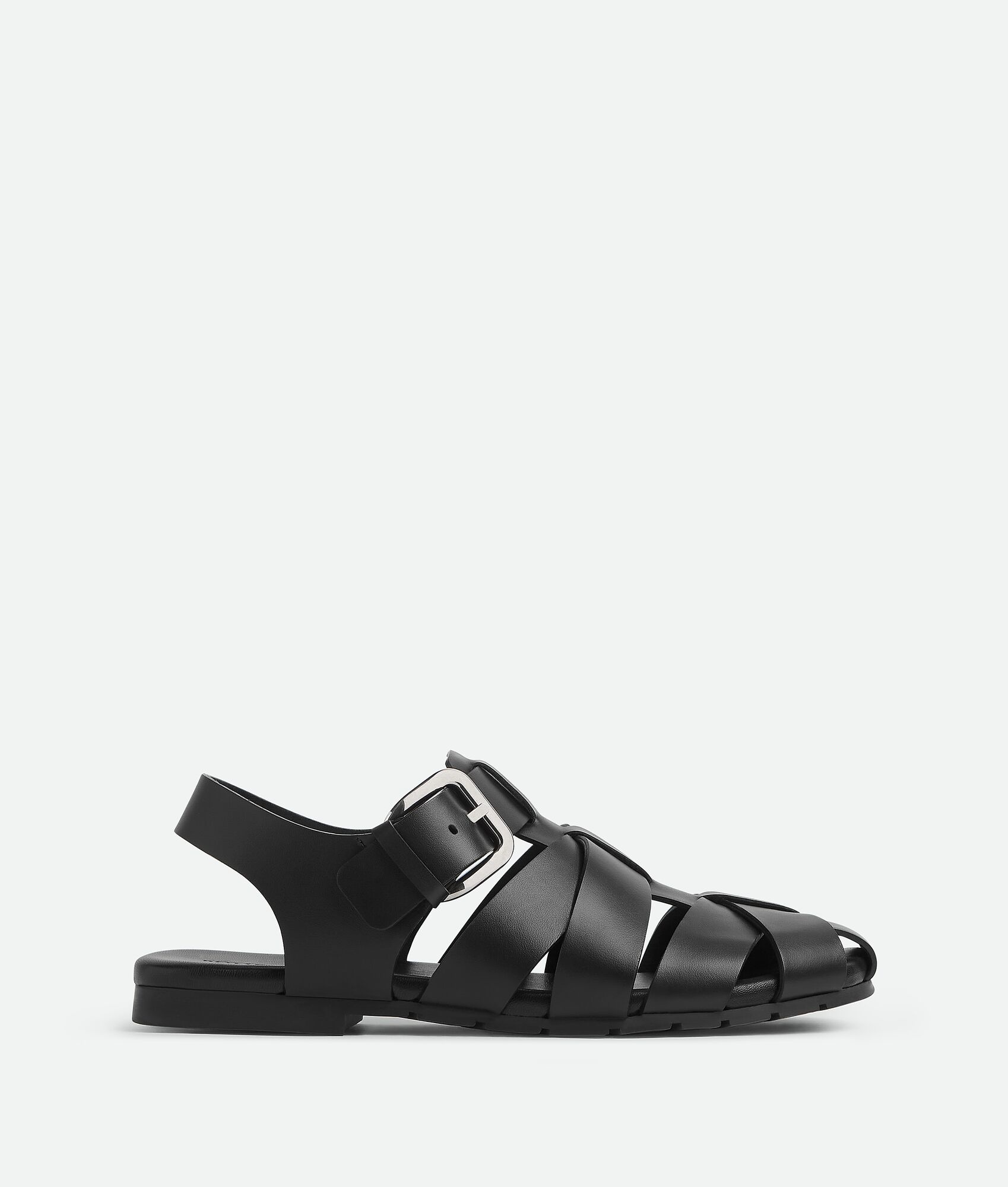 Fisherman sandal in smooth calfskin leather featuring a buckle closure. Product Details - Leather fisherman sandal - Material: Calfskin - Lining: Goatskin - Color: Black - Hardware: Silver finish - Rubber outsole - Made in: Italy - Product code: 796442V3HB01000