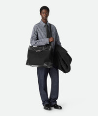 Weekender in canvas and leather with signature knot detail, featuring an adjustable Product Details - Canvas and leather weekender with adjustable and detachable cross-body strap and two top handles - One interior zipped pocket, two flat open pockets and one key hook on strap - Magnetic closure - Material: Linen, cotton, polyurethane, calfskin - Lining: Canvas - Color: Black - Hardware: Vintage Silver finish - Height: 39 cm | 15.4" - Width: 43 cm | 16.9" - Depth: 20cm - Handle drop: 9cm - Strap drop: 42cm - Made in: Italy - Product code: 827066VMAXO1253