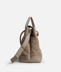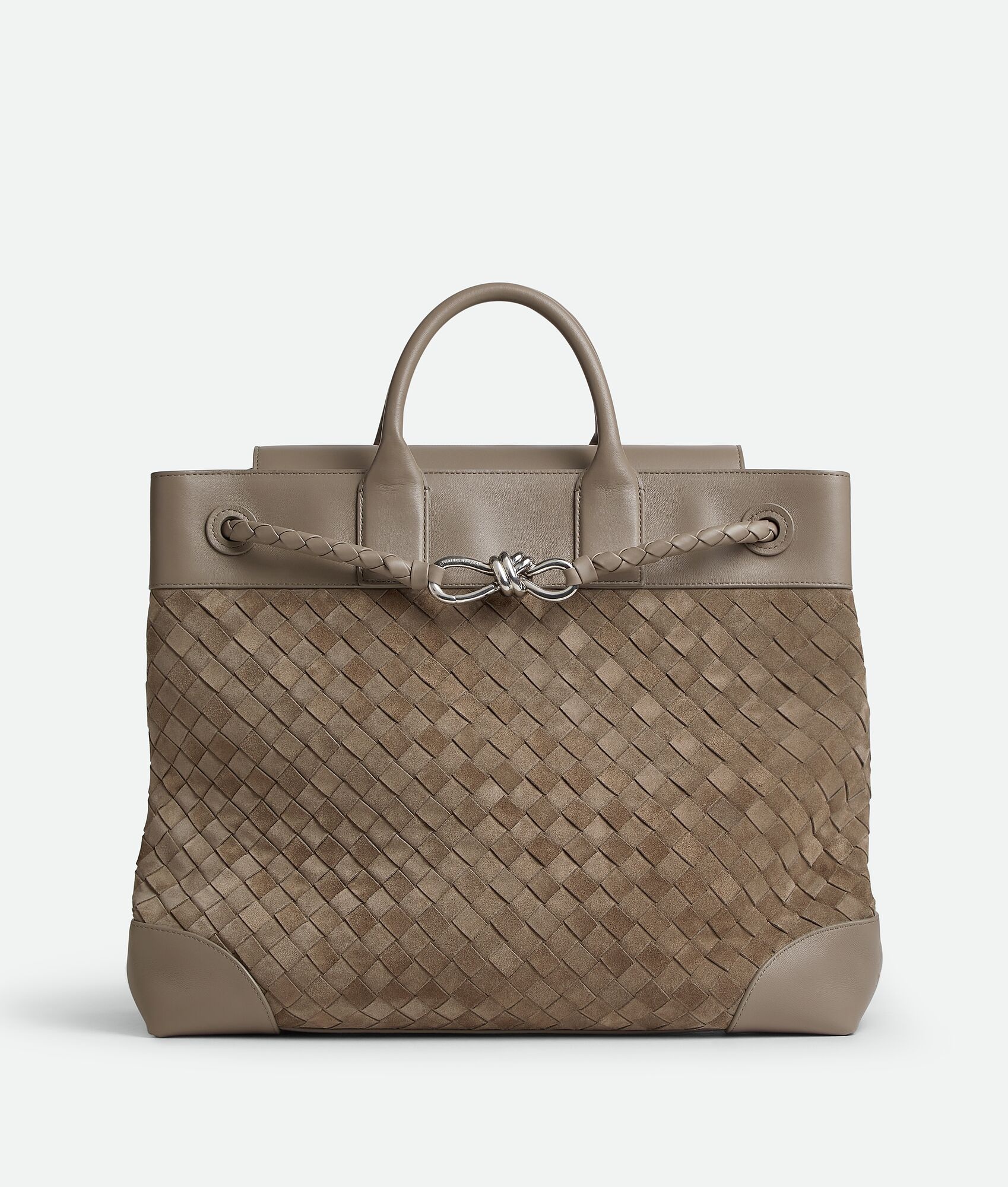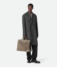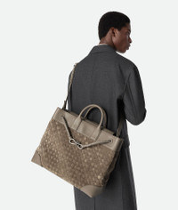 Product Details - Intrecciato suede and leather weekender with adjustable and detachable cross-body strap and two top handles - One interior zipped pocket, two flat open pockets and one key hook on a strap - Magnet closure - Lining: Canvas - Color: Limestone - Hardware: Vintage Silver finish - Height: 39 cm | 15.4" - Width: 43 cm | 16.9" - Depth: 20 cm | 7.1" - Handle drop: 9 cm | 3.5" - Strap drop: 42 cm | 16.5" - Made in: Italy - Product code: 827066V1QE52818 Size & Fit - Fits a 16" laptop