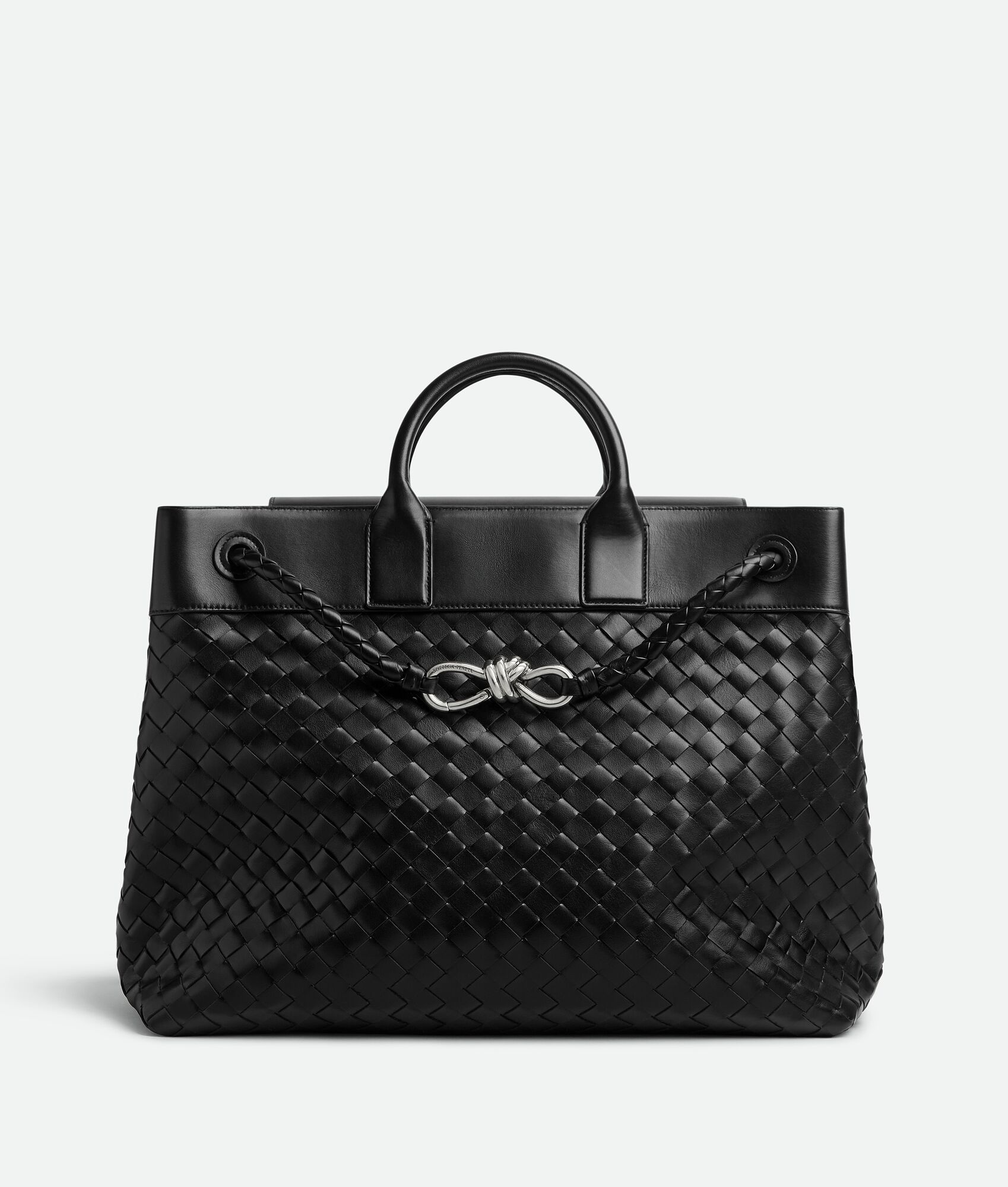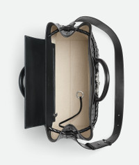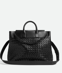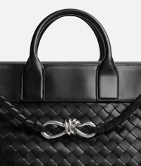 Weekender in Intrecciato leather with signature knot detail featuring an adjustable Product Details - Intrecciato leather weekender with adjustable and detachable cross-body strap and two top handles - One interior zipped pocket, two flat open pockets and one key hook on a strap - Magnet closure - Material: Calfskin - Lining: Canvas - Color: Black - Hardware: Vintage Silver finish - Height: 39 cm | 15.4" - Width: 43 cm | 16.9" - Depth: 20 cm | 7.1" - Handle drop: 9 cm | 3.5" - Strap drop: 42 cm | 16.5" - Made in: Italy - Product code: 827066V2HLD1208 Size & Fit - Fits a 16" laptop