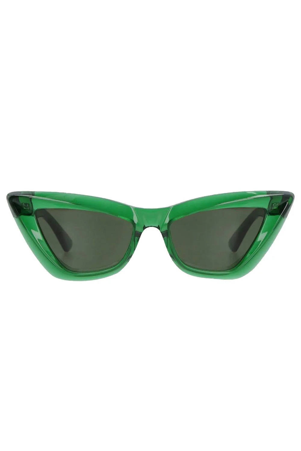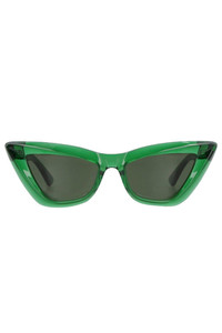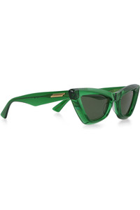 DETAILS AND INSIGHT Bottega Veneta angle cat eye sunglasses in green. 73% Acetate 27% Recycled Acetate Size: 53/17/140 Made in IT Style BV1101S-010