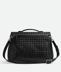 Product Details - Intrecciato silky calfskin briefcase with top handle and adjustable and detachable strap - Metallic closure with Bottega Veneta logo - Two compartments divided by a zipped laptop compartment, two flat open pockets - One exterior zipped pocket on the back - Flap closure - Lining: Canvas - Color: Black - Hardware: Silver finish - Made in: Italy - Product code: 844227V4R401208 Material - Material: Calfskin Size & Fit - Height: 30 cm | 11.8" - Width: 43 cm | 16.9" - Depth: 12.5 cm | 4.9" - Handle drop: 4.3 cm | 1.7" - Fits a 16" laptop, A4 documents, and a tablet