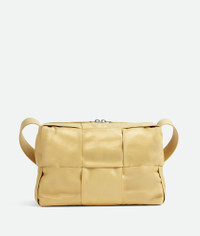 Camera bag realised with Intreccio craftsmanship in soft leather. Product details • Medium Intreccio soft leather camera bag • One interior zipped pocket • Zip closure Material: 100% Calfskin • Lining: Suede bonded Intreccio • Colour: Butter • Hardware: Silver finish • Height: 18 cm | 7.1" • Width: 28 cm | 11" • Depth: 9 cm | 3.5" • Strap drop: 50 cm | 19.7" Made in: Italy