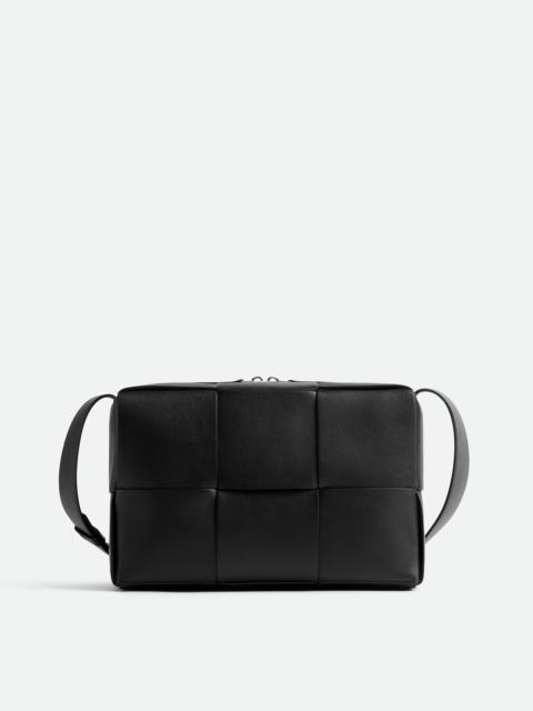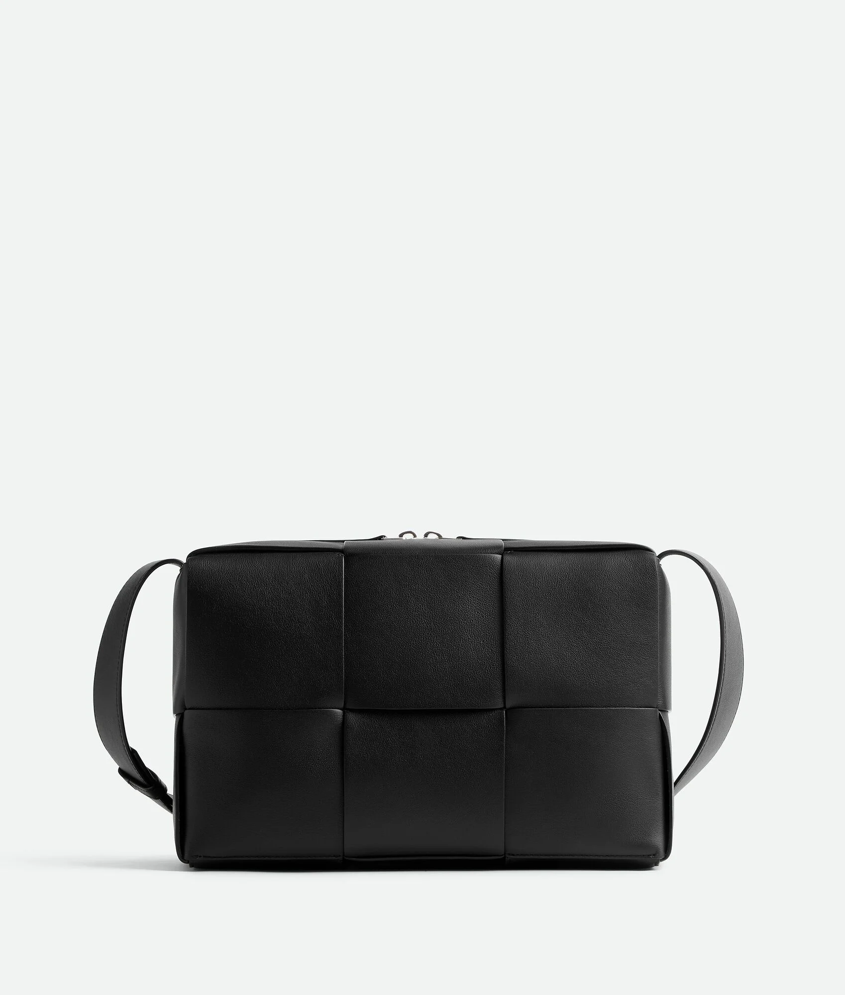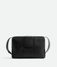Camera bag in Intreccio leather with adjustable strap. Product Details - Intreccio leather camera bag with adjustable strap - One interior zippered pocket - Zip closure - Material: Calfskin - Lining: Unlined - Color: Black - Hardware: Silver finish - Height: 18 cm | 7.1” - Width: 28 cm | 11” - Depth: 9cm - Strap drop: 50 cm | 19.7” - Made in: Italy - Product code: 731165V56A18803