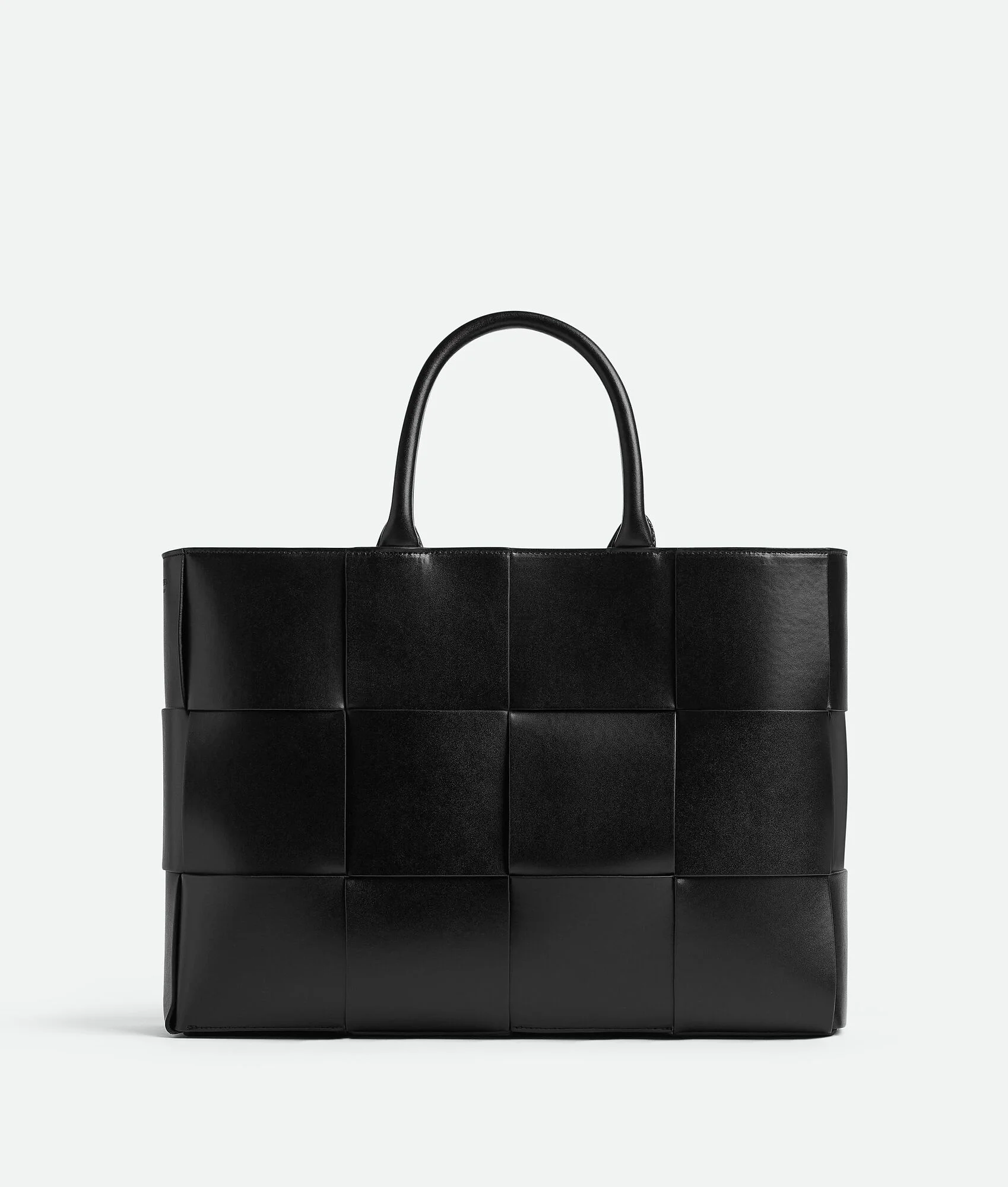 Tote bag realised with Intreccio craftsmanship in leather. Product Details - Medium Intreccio leather tote bag - Single interior detachable zipped pocket - Material: Calfskin - Lining: Bonded suede - Color: Black - Hardware: Silver finish - Height: 27 cm | 10.6" - Width: 37 cm | 14.6" - Depth: 9 cm | 3.5" - Handle drop: 13 cm | 5.1" - Made in: Italy - Product code: 756682VB1K08480
