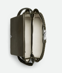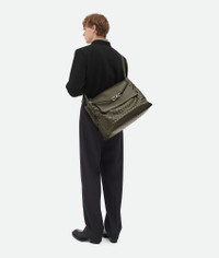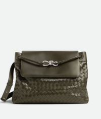 Messenger in Intrecciato leather with signature knot detail featuring an adjustable Product Details - Large Intrecciato leather messenger with adjustable and detachable cross-body strap - Two interior compartments with two flat open pockets and one zipped pocket - Flap closure - Material: calfskin - Lining: canvas - Color: Kaki - Hardware: Vintage Silver finish - Height: 32 cm | 12.6" - Width: 43 cm | 16.9" - Depth: 20 cm | 7.9" - Handle drop: 10 cm | 1.5" - Strap drop: 43 cm | 16.9” - Made in: Italy - Product code: 805969V2HLD3388