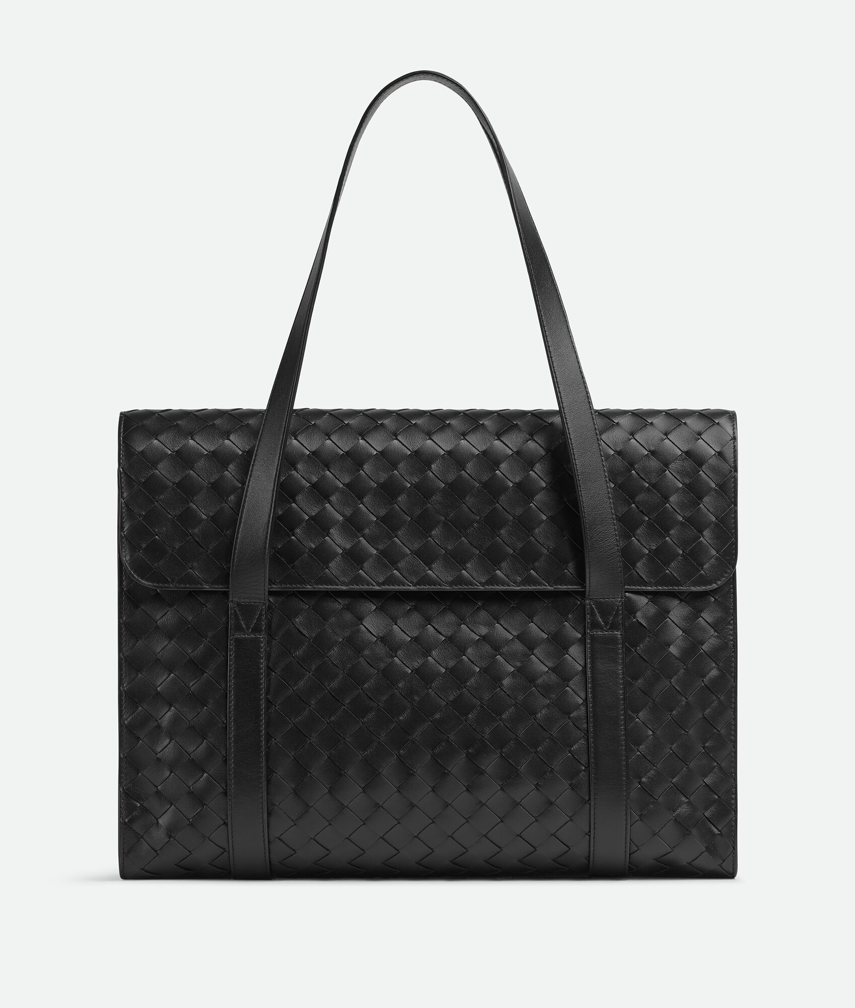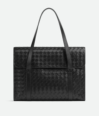 Flap briefcase in Intrecciato leather with shoulder handles. Product Details - Intrecciato leather flap briefcase with shoulder handles - Gusset width adjustable with snap buttons - One interior zipped pocket and two flat open pockets - Flap closure - Material: Calfskin - Lining: Canvas - Color: Black - Hardware: Silver finish - Height: 32 cm | 12.6" - Width: 41 cm | 16.1" - Depth: 8 cm | 2.6" - Handle drop: 23 cm | 9.1" - Made in: Italy - Product code: 795102V2HL18803