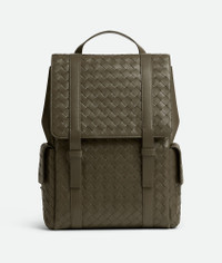Backpack in Intrecciato leather. Product Details - Intrecciato leather backpack - Two exterior flap pockets - Single interior laptop compartment and two open pockets - Flap closure - Lining: Canvas - Color: Cypress - Hardware: Silver finish - Height: 39 cm | 15.4" - Width: 31 cm | 12.2" - Depth: 14 cm | 5.5" - Handle drop: 6 cm | 2.4" - Made in: Italy - Product code: 805971V2HL13227 Size & Fit - Fits a 16" laptop, A4 documents, and a tablet