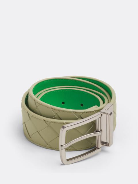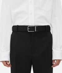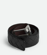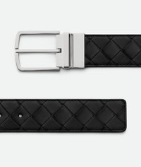 Reversible belt in Intrecciato Nappa leather. Product Details - Reversible belt in Intrecciato Nappa leather - Calf leather on reverse - Rectangular pin buckle and leather loop fastening - Material: calfskin - Lining: Nappa - Color: Black/Fondant - Hardware: Silver finish - Height: 3.5 cm | 1.4" - Depth: 0.5 cm | 0.2" - Made in: Italy - Product code: 652944VCPQ11205