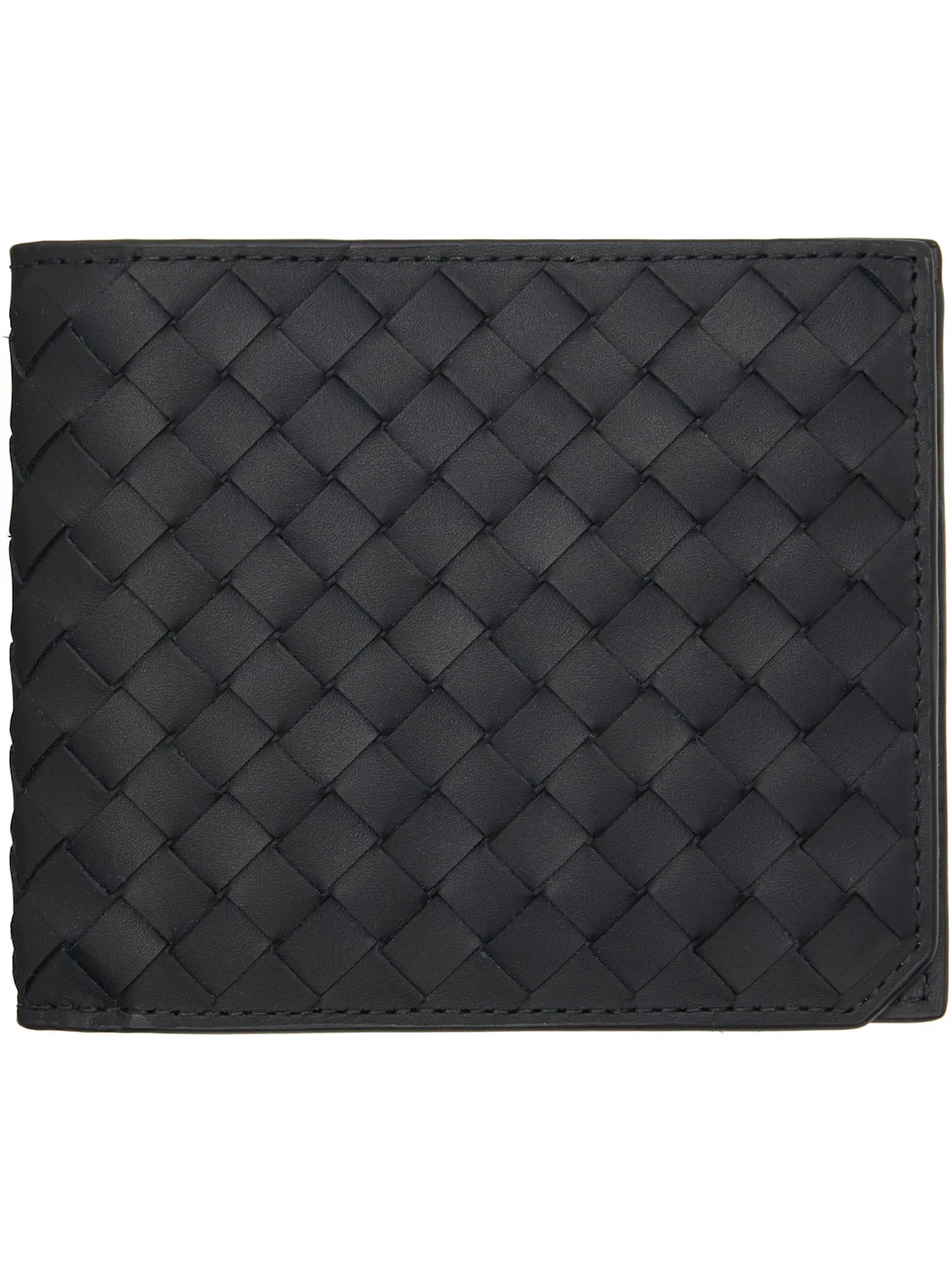 Intrecciato-woven buffed calfskin bifold wallet. · Eight card slots · Two patch pockets · One note slot · H3.75" x W4.5" Supplier color: Black Calfskin. Made in Italy 252798M164014