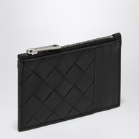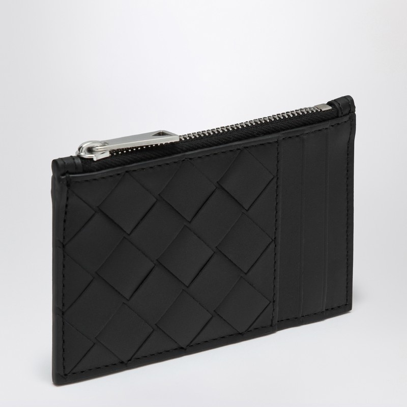 Card case by Bottega Veneta in black leather with Intrecciato pattern, featuring six credit card slots, a zipped pocket and metal elements with a silver finish.