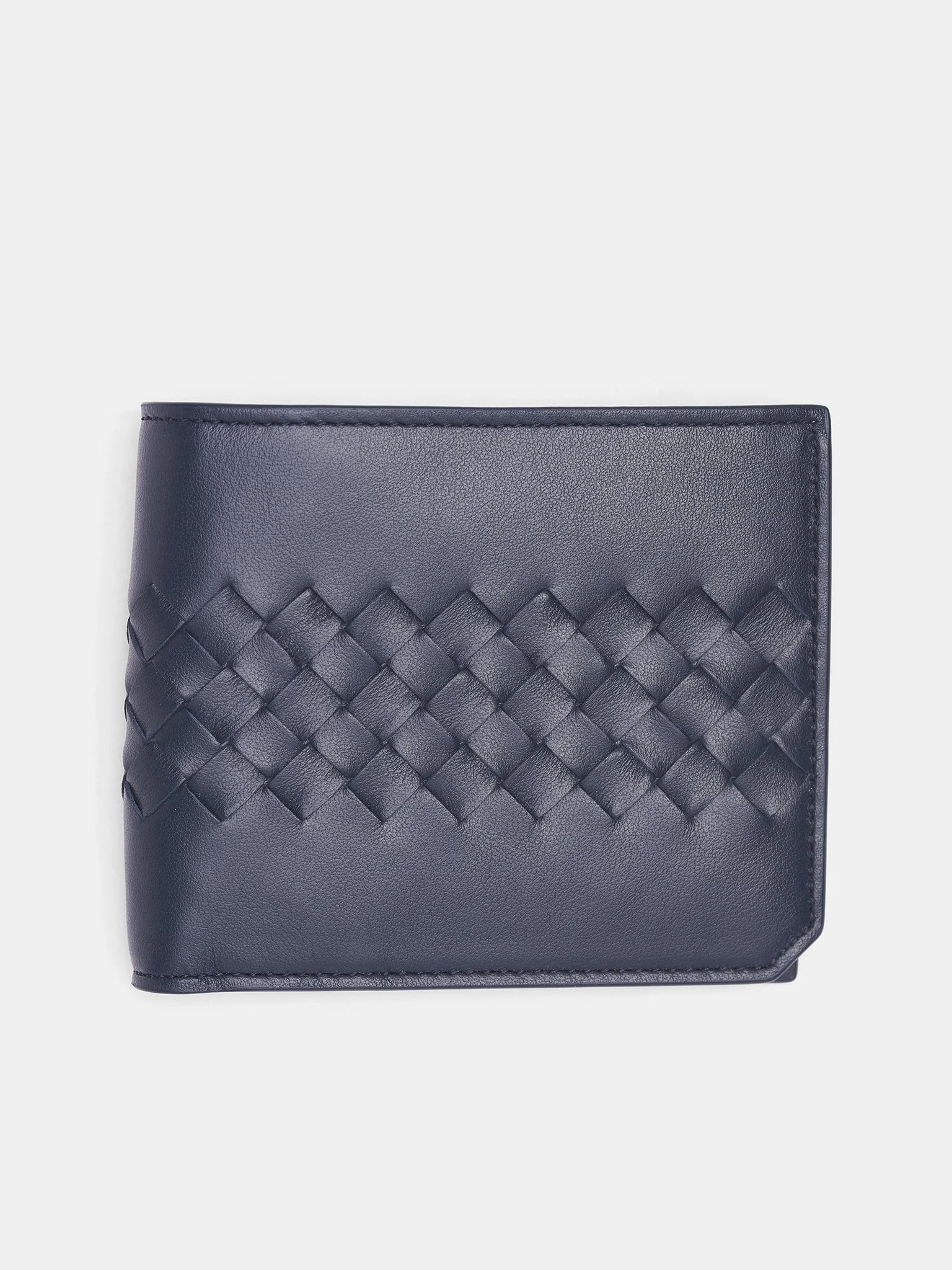 Dark blue calfskin bi-fold wallet with signature Intrecciato pattern and smooth leather side details. Featuring: • Signature Intrecciato pattern • Eight card slots • Interior pocket • Lined • Made in Italy • 100% Calfskin • One size