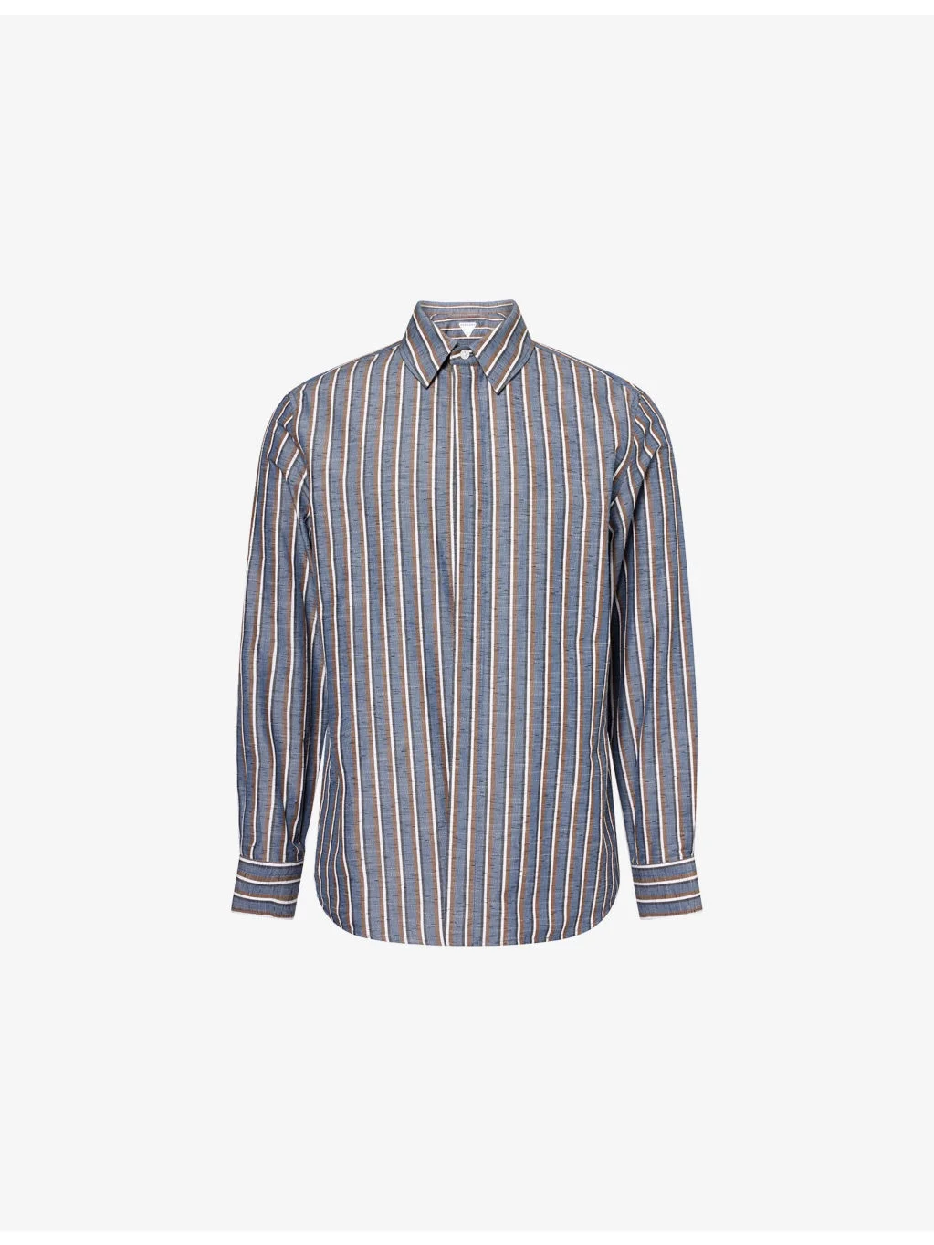 PRODUCT DETAILS - Bottega Veneta cotton and linen-blend shirt - 84% cotton, 12% linen, 4% polyamide - Concealed button fastenings at front - Straight-point collar - Regular fit, collar, long sleeves, buttoned cuffs, all-over bold-stripe print, curved hem - Dry clean - Made in Italy - Size UK 40: length 32in / 81cm, chest 40in / 101cm - Model is 6ft 2in/1.88m and wears a size UK 40 - Lightweight, non-stretch Ref: R04462265