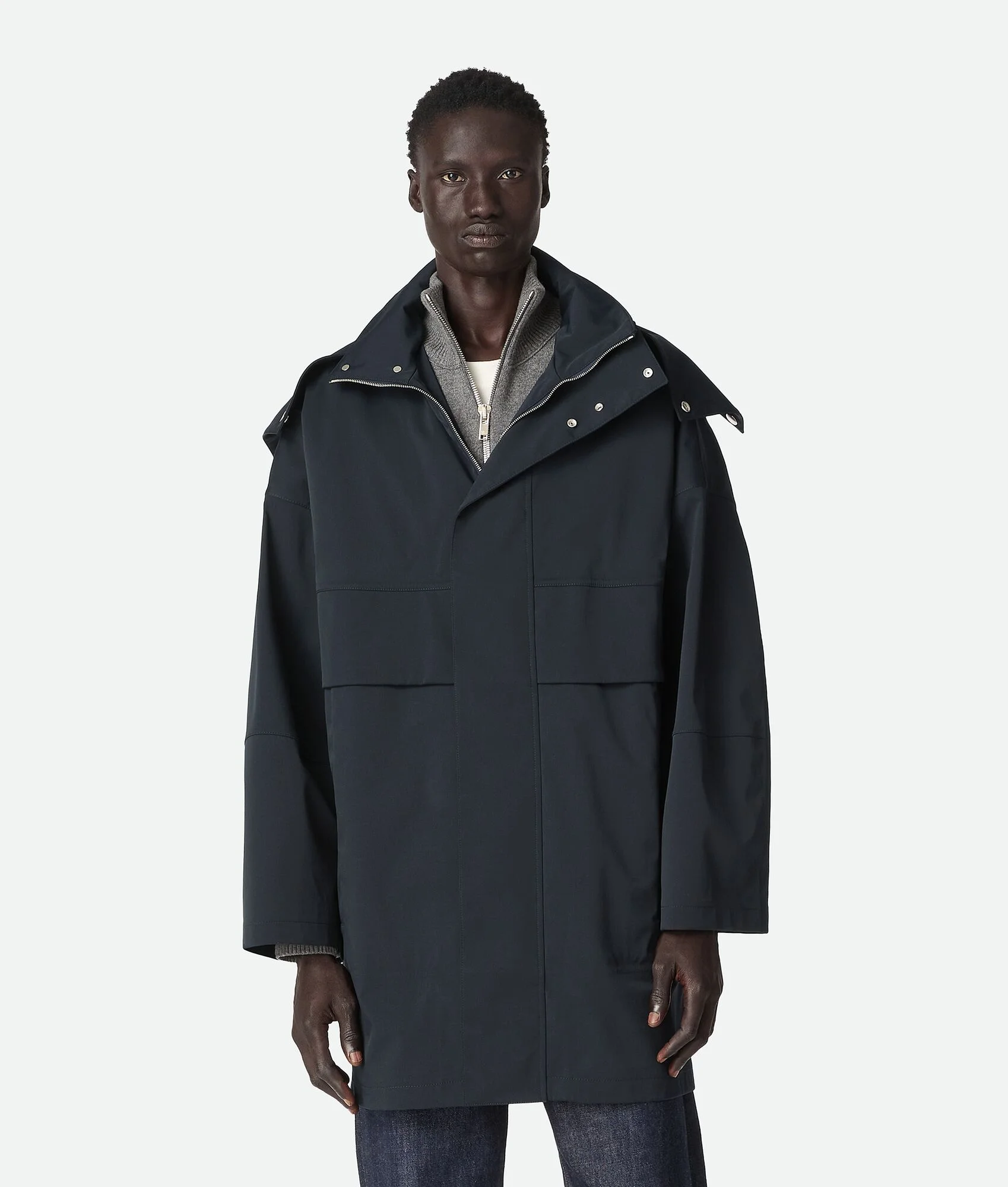 Parka with detachable hood in bonded matte technical wool and jersey. Product Details - Bonded matte tech wool and jersey hooded parka - Detachable hood - Interior special label - Zip and snap button closure - Fully lined in mesh nylon - Color: Navy - Made in: Italy - Product code: 841431V5VP04121 Material - Material: 54% Wool, 40% polyamide, 6% elastane Size & Fit - Model is 188 cm|6'2" and is wearing a Bottega Veneta size 46