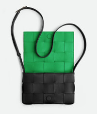 Cross-body bag realised with Intreccio craftsmanship in leather with contrasted interior. Product Details - Medium Intreccio leather cross-body bag - Single interior zipped pocket - Magnetic closure - Material: calfskin - Lining: Calfskin bonded Intreccio - Color: Black/Parakeet - Hardware: Silver finish - Height: 15 cm | 5.9" - Width: 23 cm | 9.1" - Depth: 5 cm | 2" - Strap drop: 52 cm | 20.5" - Made in: Italy - Product code: 737950V29E01091