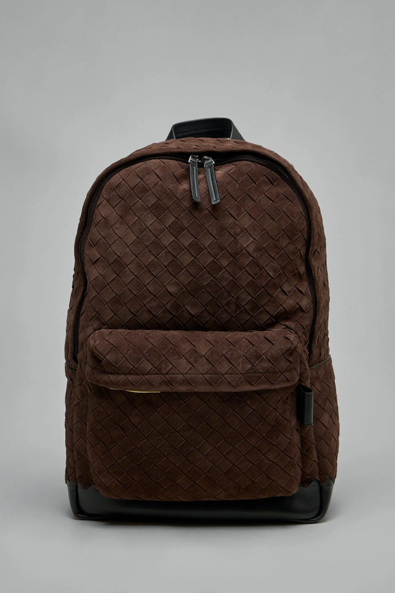 Backpack featuring a woven texture with a rich brown color, offering a blend of style and functionality. The backpack includes a front pocket and adjustable black straps for convenient use. Materials: Suede Color: brown SKU: 150964 Brand style: 828117-V1QEC-BORSA-INTR-15-LIGHT-SUEDE-C-AV-B-V-WE-2609-FONDANT-BLACK-SILVER