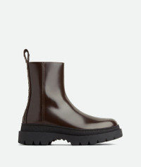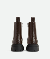 Ankle boot realised in shiny calfskin with Intrecciato craftsmanship on the backstay Product Details - Leather ankle boot - Intrecciato backstay and loop detail - Side zip closure - Material: Calfskin - Lining: Calfskin - Color: Fondant/Black - Rubber outsole - Flatform: 3.5 cm | 1.4" - Made in: Italy - Product code: 775280V3NS02139