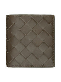 Intrecciato-woven buffed calfskin bifold wallet in brown. · Six card slots · Two patch pockets · One note slot · H4" x W3.75" x D1" Supplier color: Khaki 100% calfskin. Made in Italy 242798M164004