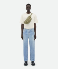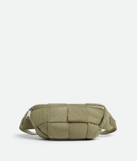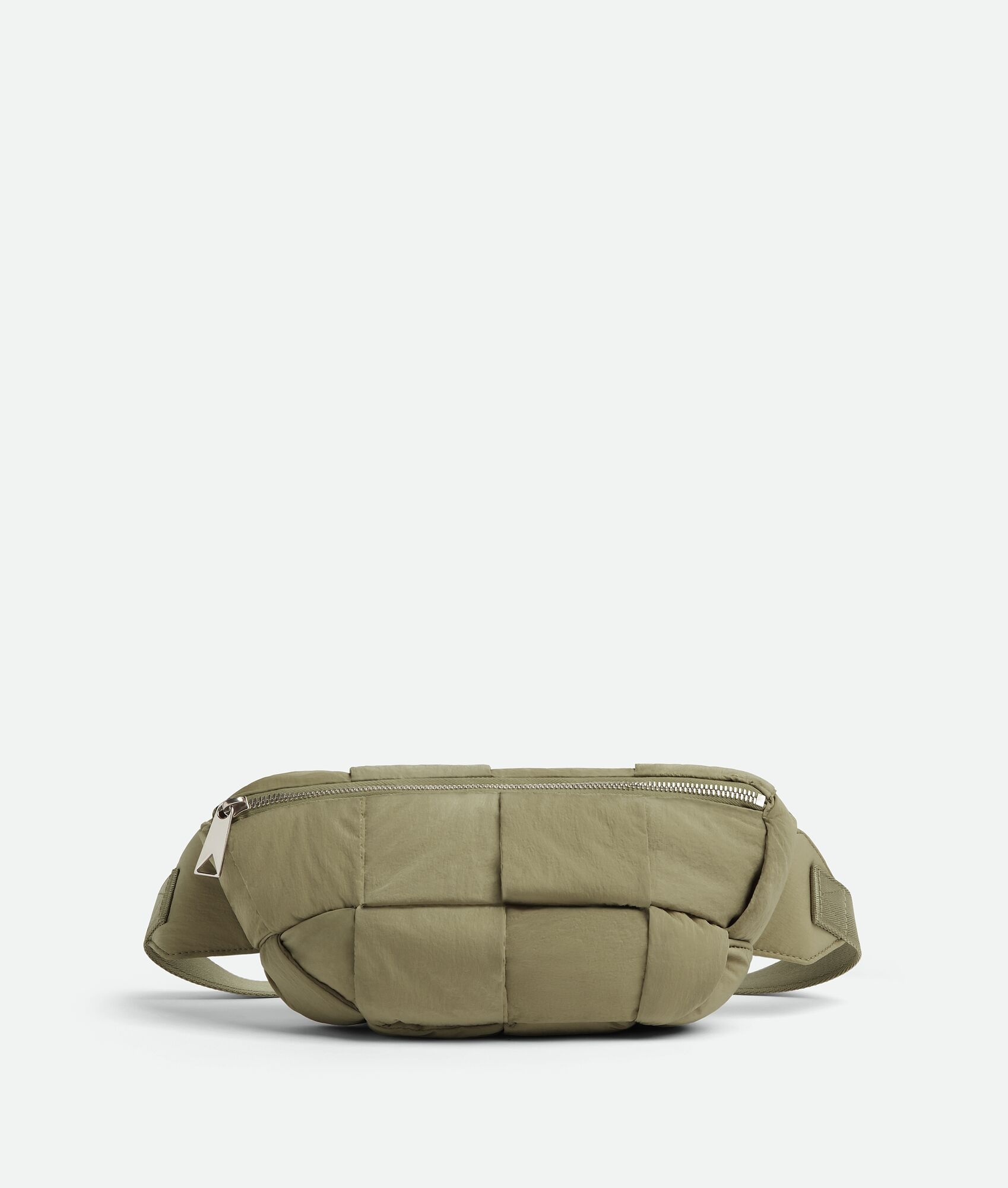 Waist bag made from lightweight padded nylon using Intreccio craftsmanship. Product details • Padded Intreccio nylon bumbag • Single compartment • Adjustable webbing strap with snap buckle closure • Zip closure Material: 100% Polyester • Lining: Nylon • Color: Travertine • Hardware: Silver finish • Height: 14 cm | 5.5" • Width: 28 cm | 11" • Depth: 7 cm | 2.75" • Strap drop: 21 cm | 8.3" Made in: Italy