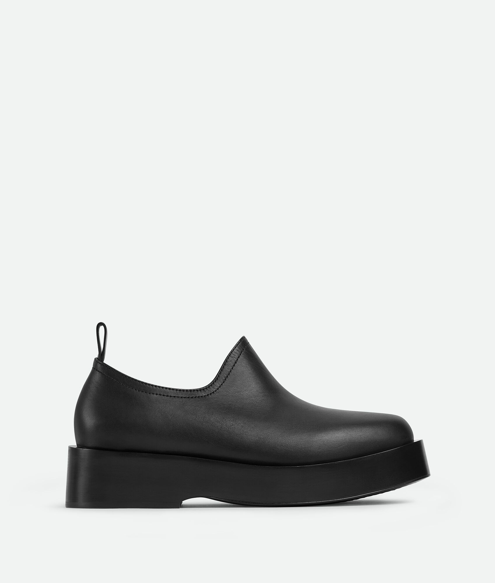 Slip-on shoe in smooth calfskin leather featuring a flatform outsole and an Intrecciato Product Details - Leather slip-on shoe - Insole with high-frequency Intrecciato pattern - Material: calfskin - Lining: Calfskin - Color: Black - Leather outsole - Flatform: 5 cm | 2” - Made in: Italy - Product code: 810477V4QK01000