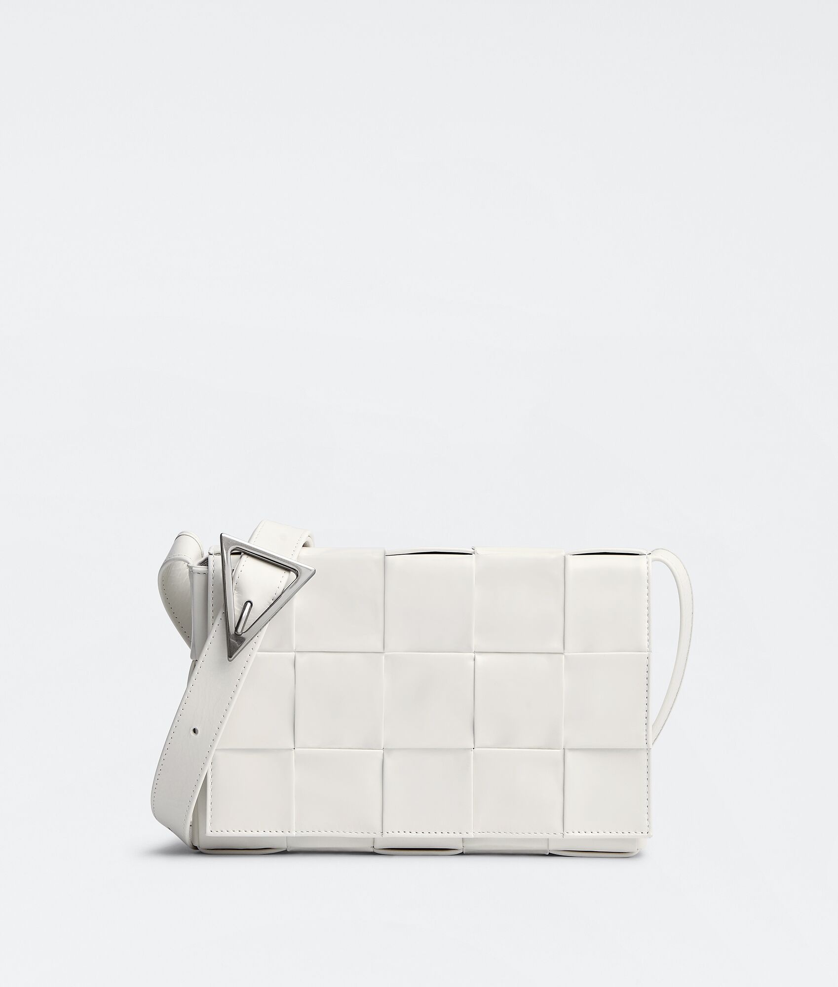 • Intreccio leather cross-body bag • Single interior zipped pocket • Magnetic closure Material: 100% Calfskin • Unlined • Color: White • Hardware: Silver finish • Height: 15 cm | 5.9" • Width: 23 cm | 9.1" • Depth: 5 cm | 2.0" • Strap drop: 55 cm | 21.7" Made in: italy