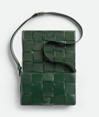 Medium Intreccio leather cross-body bag. Product Details - Medium Intreccio leather cross-body bag - Single interior zipped pocket - Magnetic closure - Material: Calfskin - Lining: Nylon bonded Intreccio - Color: Raintree - Hardware: Silver finish - Height: 15 cm | 5.9" - Width: 23 cm | 9.1" - Depth: 5 cm | 2" - Strap drop: 52 cm | 20.5" - Made in: Italy - Product code: 667298VCQ713061