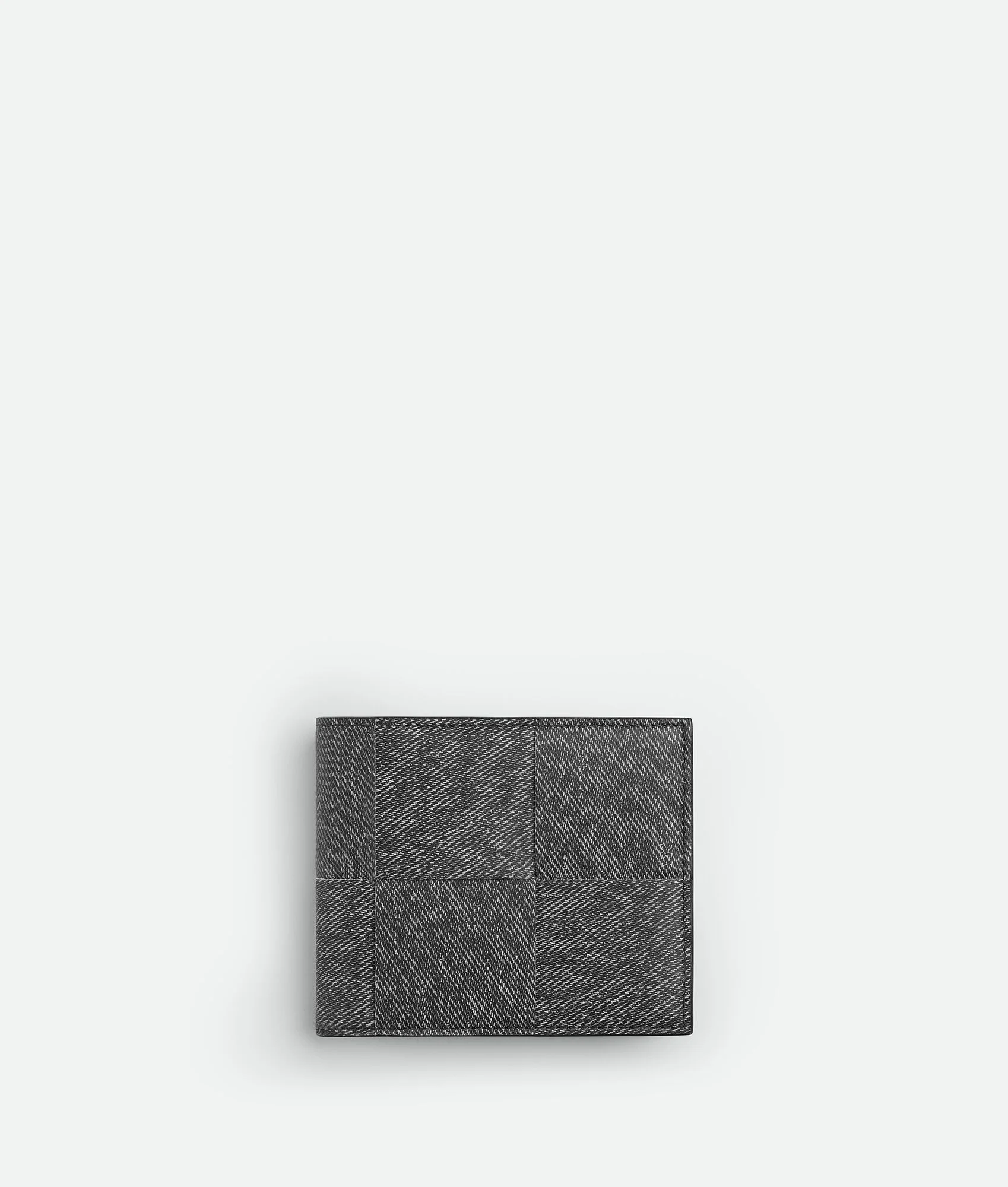 Bi-fold wallet in Intreccio nabuk leather with printed denim effect. Product Details - Intreccio nubuck leather wallet with printed denim effect - Six card slots, one note compartment, two additional pockets - Lining: Calf leather - Color: Mid Gray/Ardoise - Height: 8.5 cm | 3.3" - Width: 10 cm | 3.9" - Depth: 1 cm | 0.4" - Made in: Italy - Product code: 743004V5UF11214